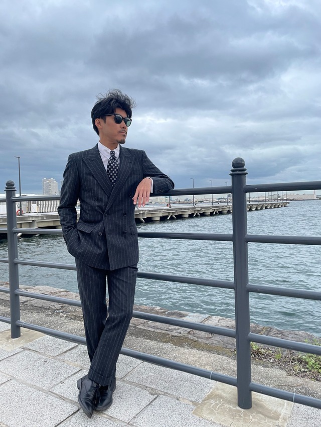 帰ってきたのタカをイメージしたフランネルチョークストライプのグレーダブルスーツです。 控えめな光沢で暖かみや渋さ・季節感を味わえ、秋冬に大活躍する1着です。 肩幅も割とジャストサイズで、ウェストの絞りも適度にあるため、80年代とは違いシャープなシルエットですが、ダブルブレスト&ツータックでダンディズムはしっかり味わっていただけます。 パンツはツータック、裾のダブル幅は4.5cmで貫禄や余裕、風格を感じます。 またパンツの内側にサスペンダーボタンを付けてあります。サスペンダーで吊ってドレスな着こなしを楽しめるようにバージョンアップしてあります。 仕事着としてはもちろん、横浜に浸れるので、タカの気分を味わえる渾身のスーツです。 袖は本切羽で腰ポケットはフラップあり、ツギ台場で裏地はキュプラ100%の総裏仕様です。 ※本製品は作品の映像や展示された劇中衣装をもとにできる限り、再現させたものです。 ※本製品は、お客様都合によるキャンセルや返品、交換不可の受注生産品です。 お届けまでにおよそ40日いただきます。 ※表生地の在庫が切れ次第、類似した生地での受注となるため、写真の質感と同一のものは早い者勝ちです。 ※サイズスペック表から寸法を修正して、ご要望通りのサイズで仕上げることが可能です。その際は、購入時の入力画面の"備考欄"に修正寸法を入力ください。 例) 購入サイズに着丈プラス3cm ※持込オーダーは持ち込んだスーツと同じ寸法で仕上げさせていただきます。 ご希望の方は「持込オーダー」を選択いただき、決済を完了いただいた後に持込スーツの送り先を送ります。送料はお客様負担となりますが持込スーツをお送りください。 〜商品詳細〜 品名:帰ってきた タカ フランネルチョークストライプ グレーダブルスーツ 表地:ウール100% 身頃裏地:キュプラ100%ベージュ 色柄:フランネルチョークストライプグレー 商品寸法:サイズスペック画像参照 縫製:日本製 モデル(コーイチ 177cm 66kg)着用サイズ:M 腰ポケット:フラップ有 ベント:サイドベンツ 〜取り扱いについて〜 ※ご家庭での洗濯は避けて下さい。 ※雨等で濡れたときは、陰干しにして乾かして下さい。 ※タンブラー乾燥、アイロンがけはお避け下さい。 その他、不明点やご質問は下記の"あぶ刑事ファッションチャンネルLINE@"からどうぞ問い合わせください。 https://lin.ee/zdMX4MA