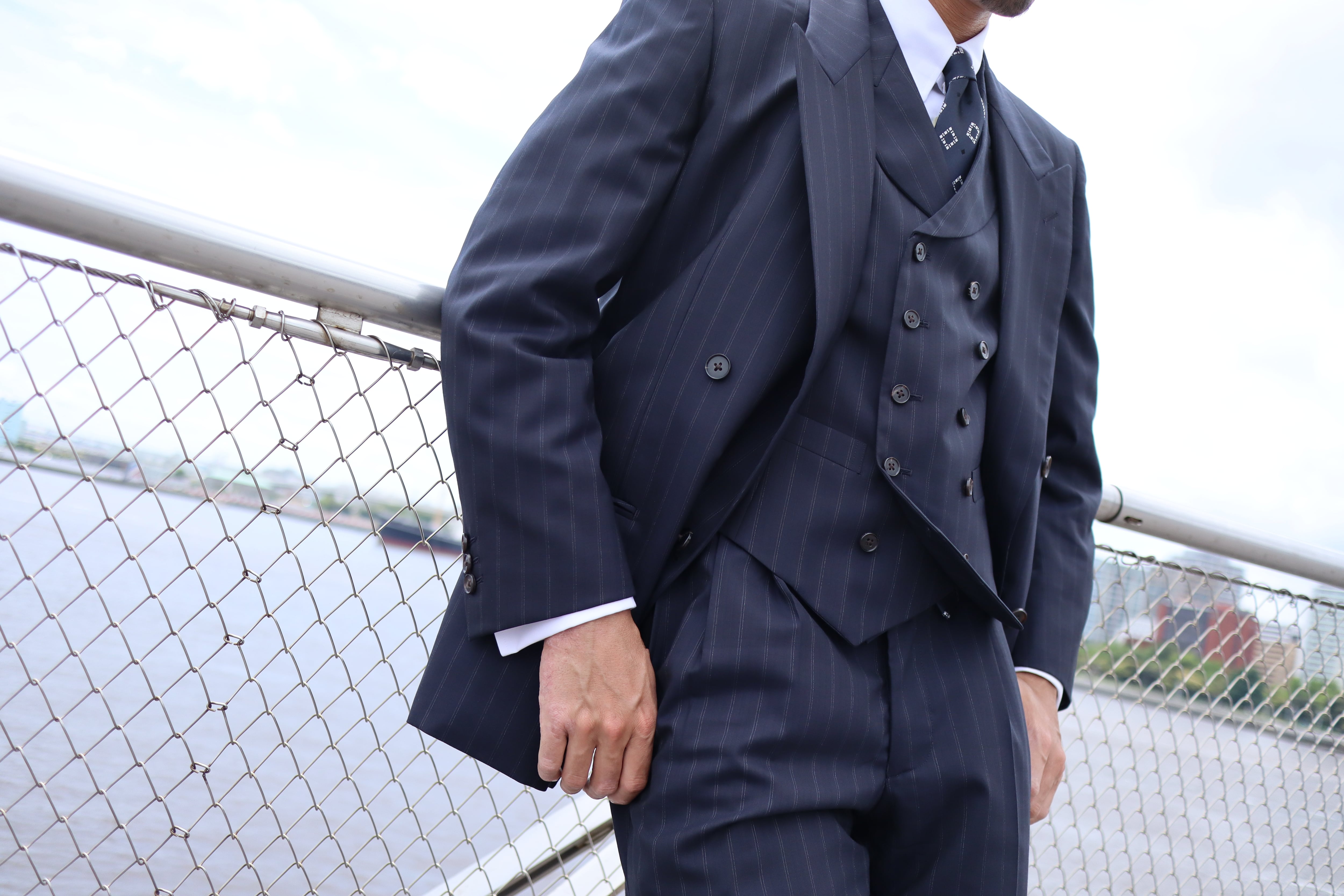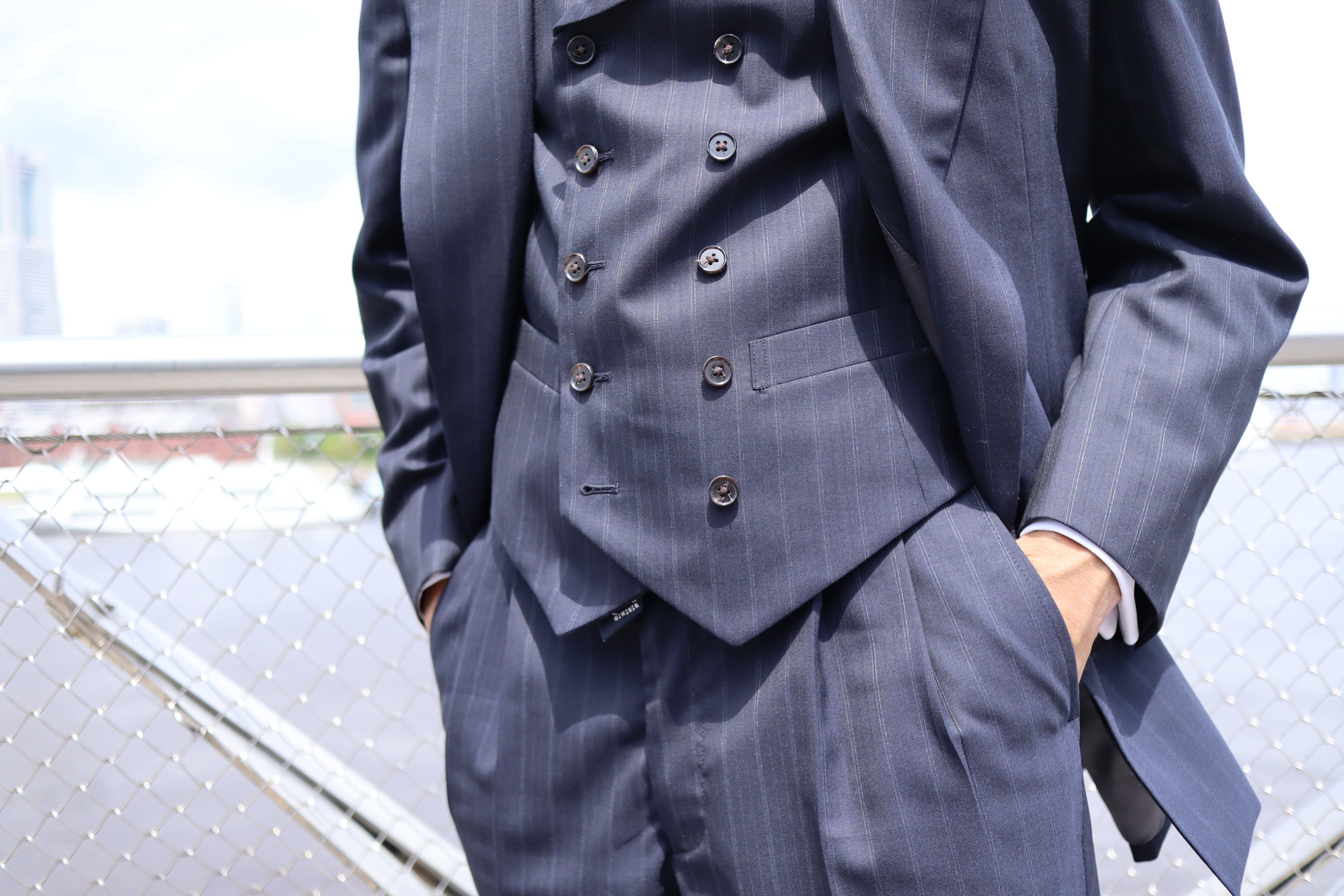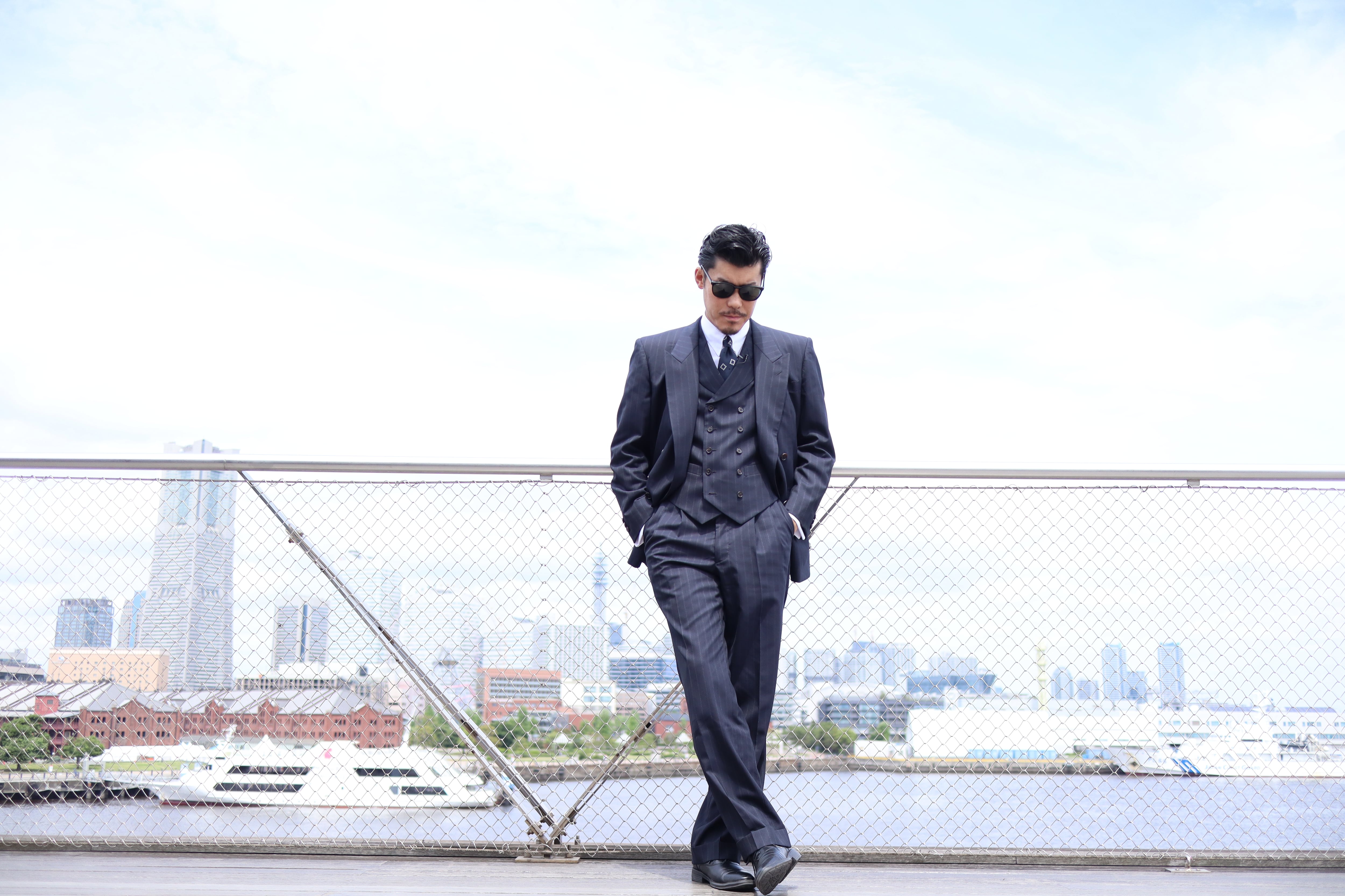 生地はクラシカルで希少性のある、濃紺のダブルストライプ。ビンテージ感があり、仕立て映えとドレープ感を両立した厳選された生地を使用しております。