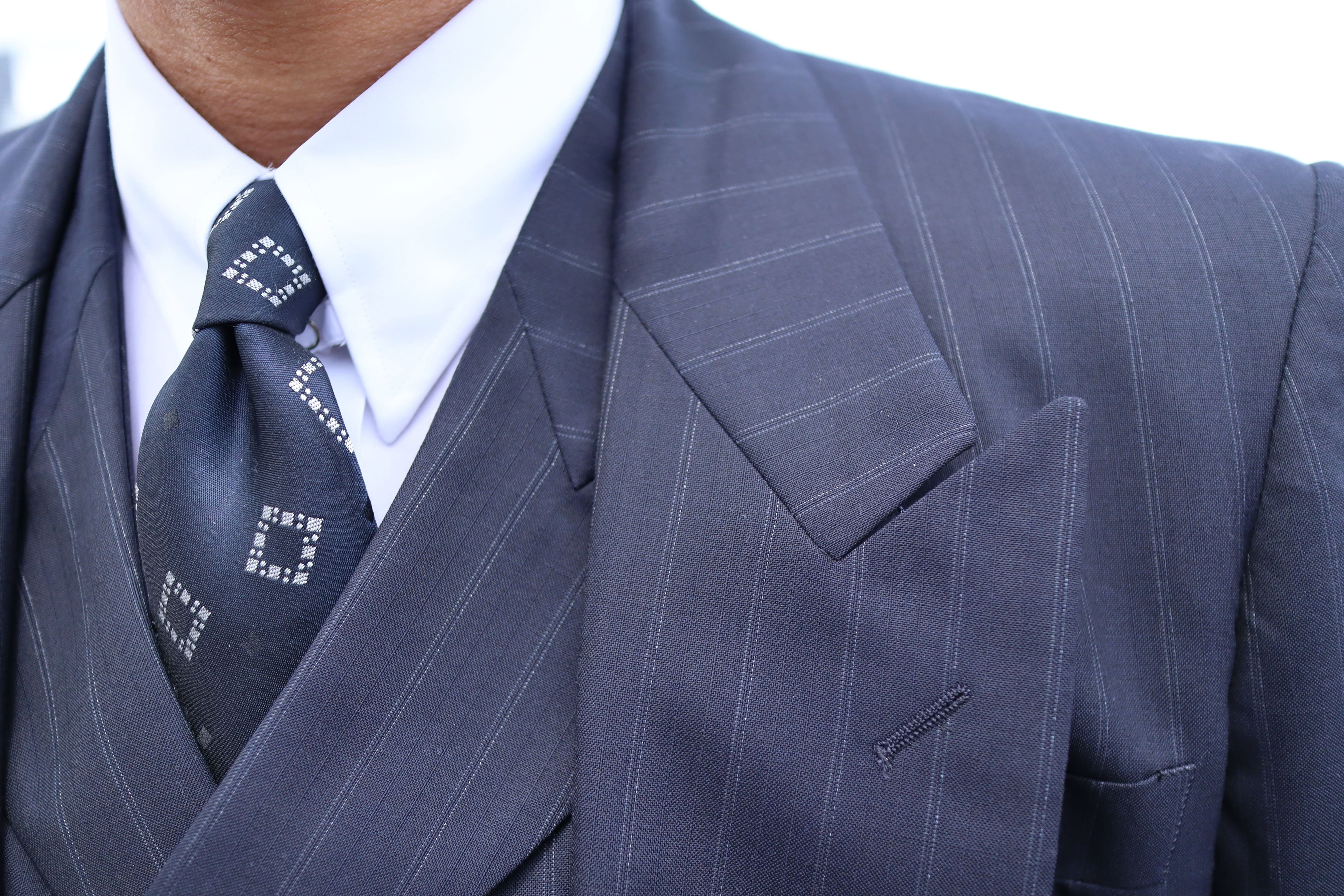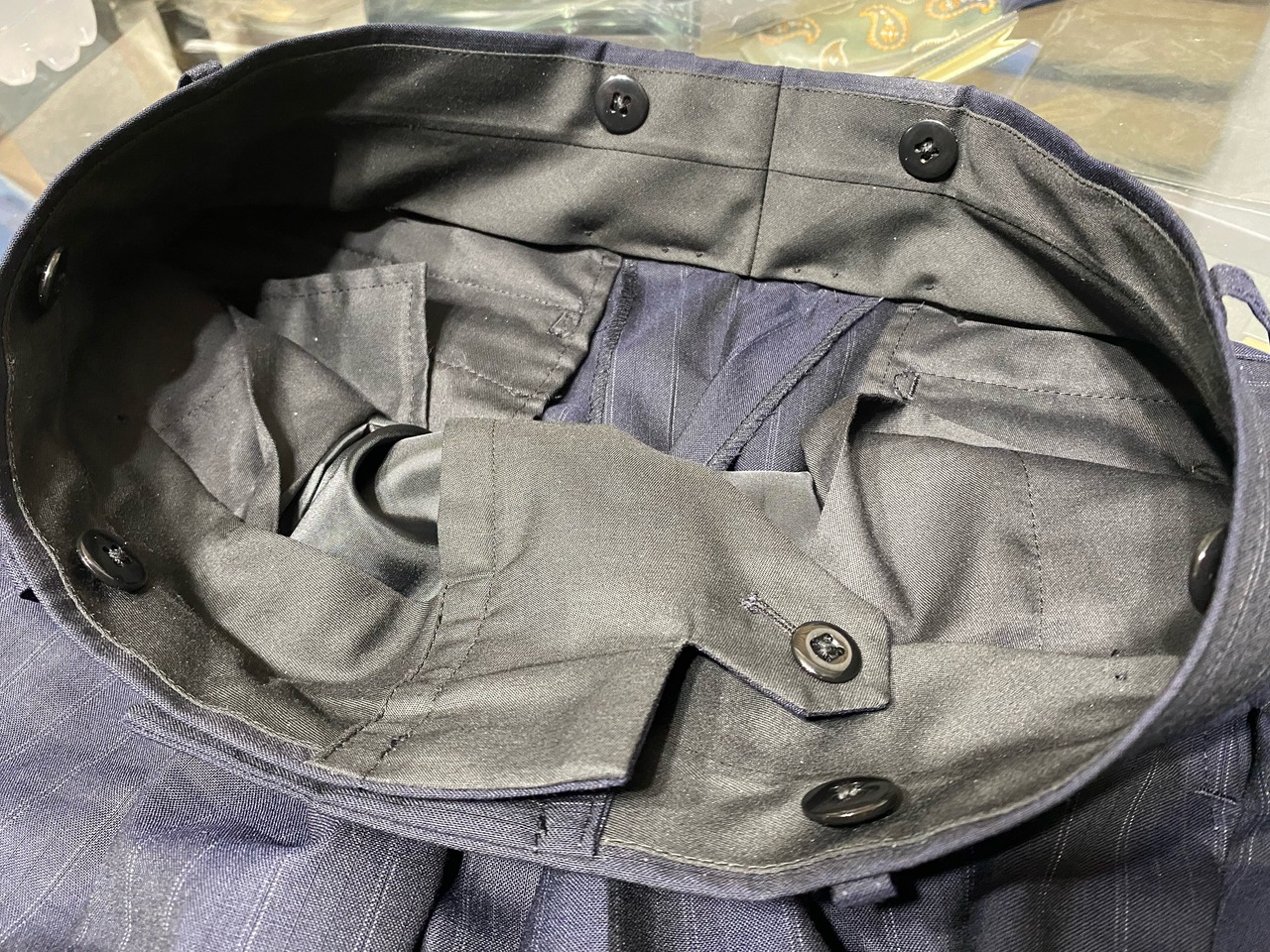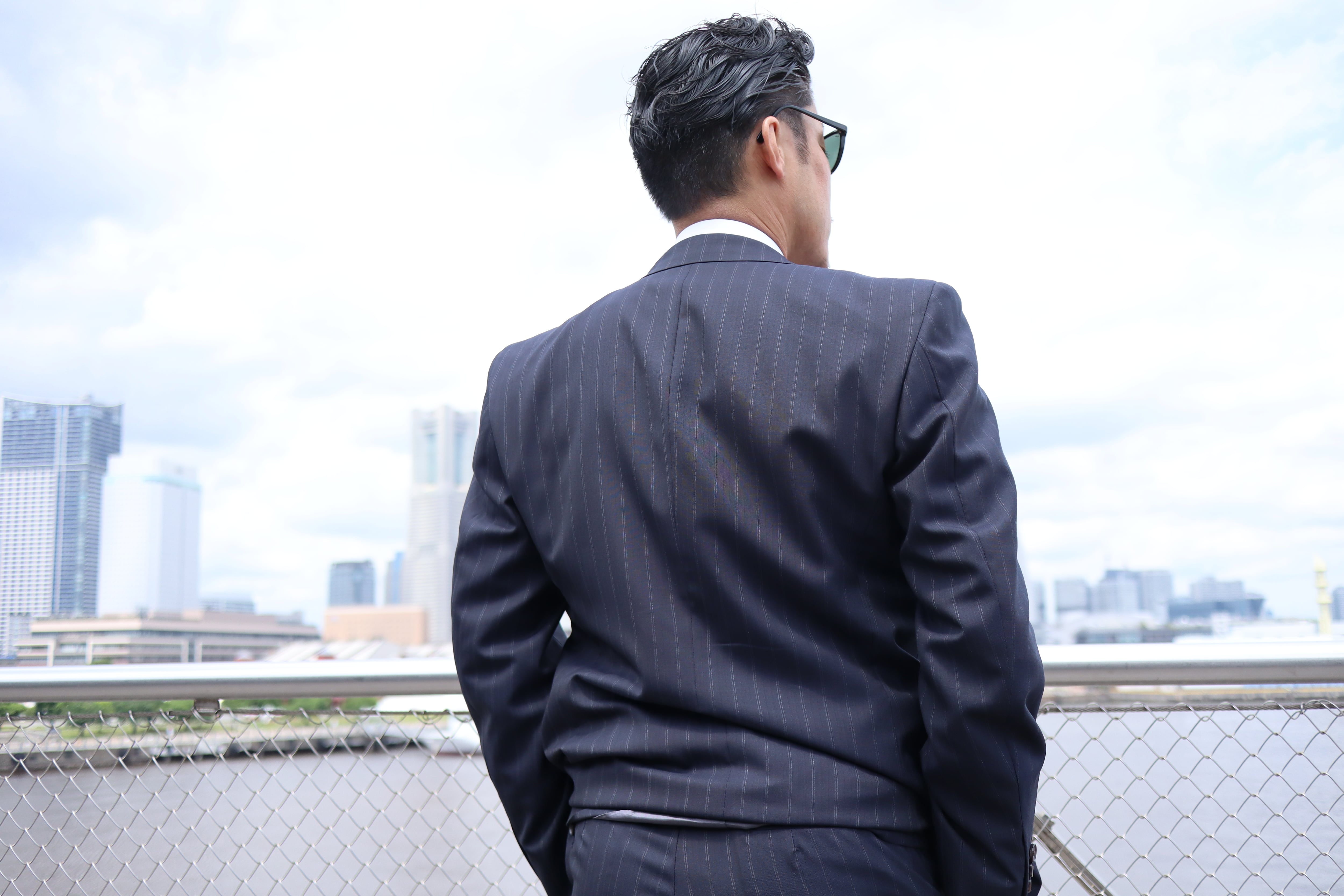 生地はクラシカルで希少性のある、濃紺のダブルストライプ。ビンテージ感があり、仕立て映えとドレープ感を両立した厳選された生地を使用しております。