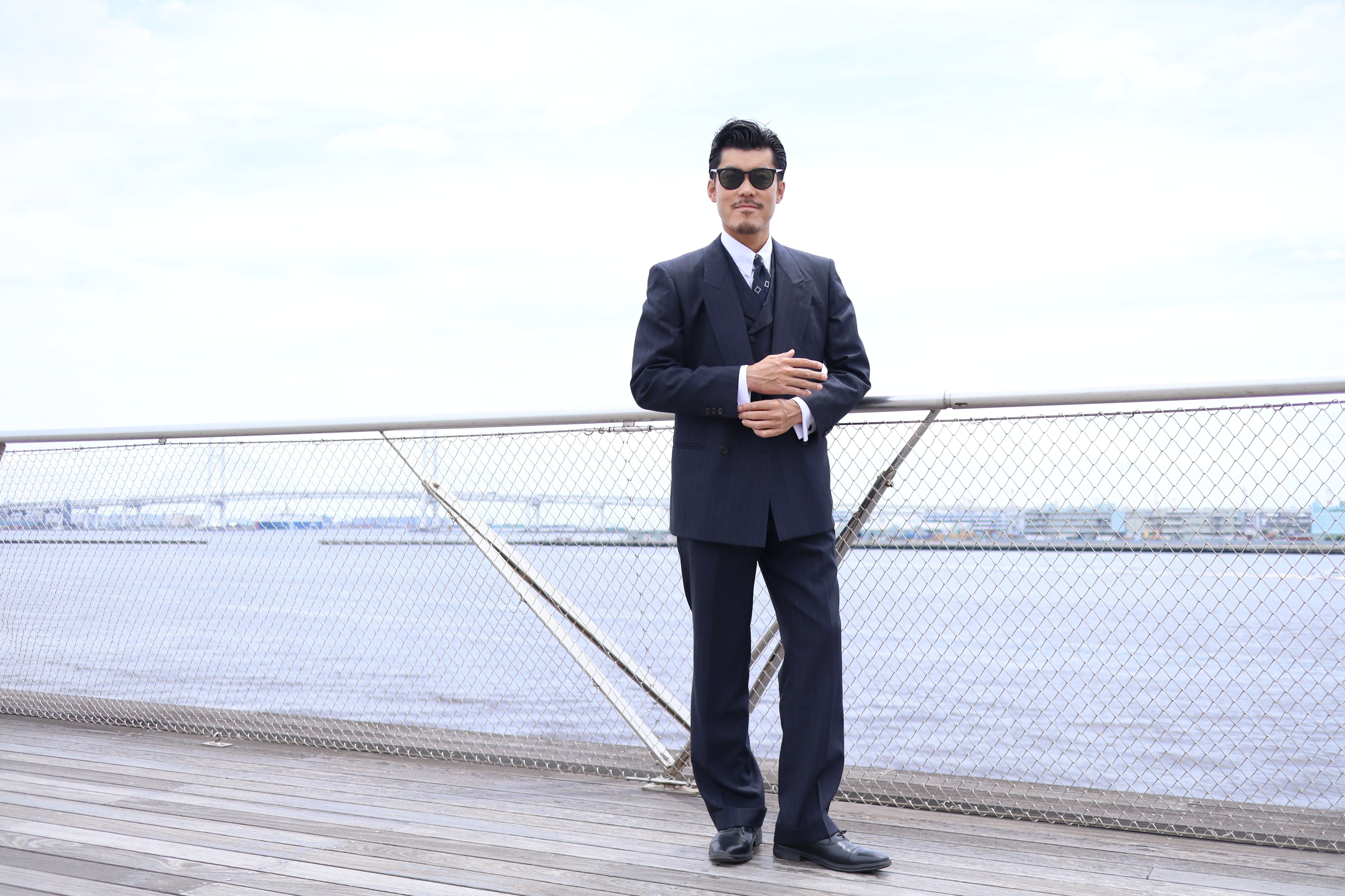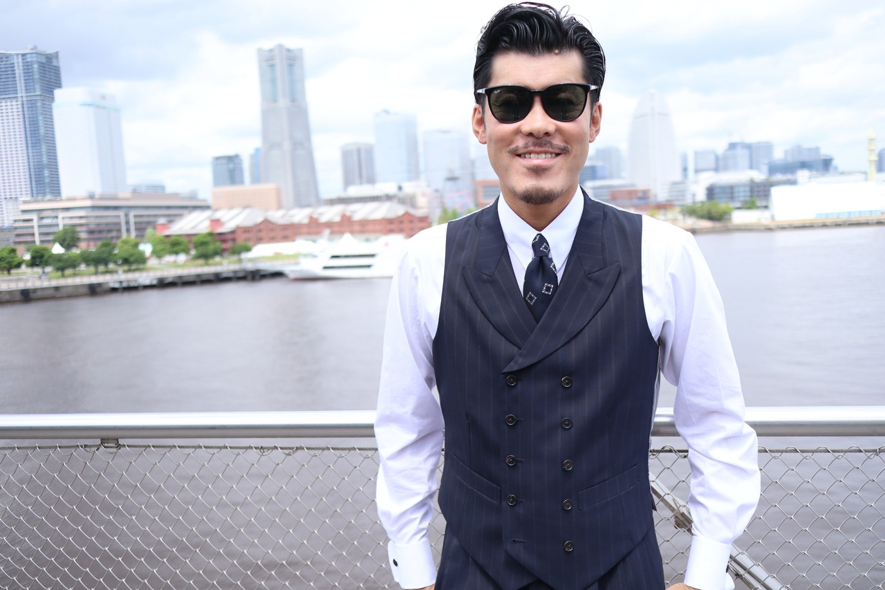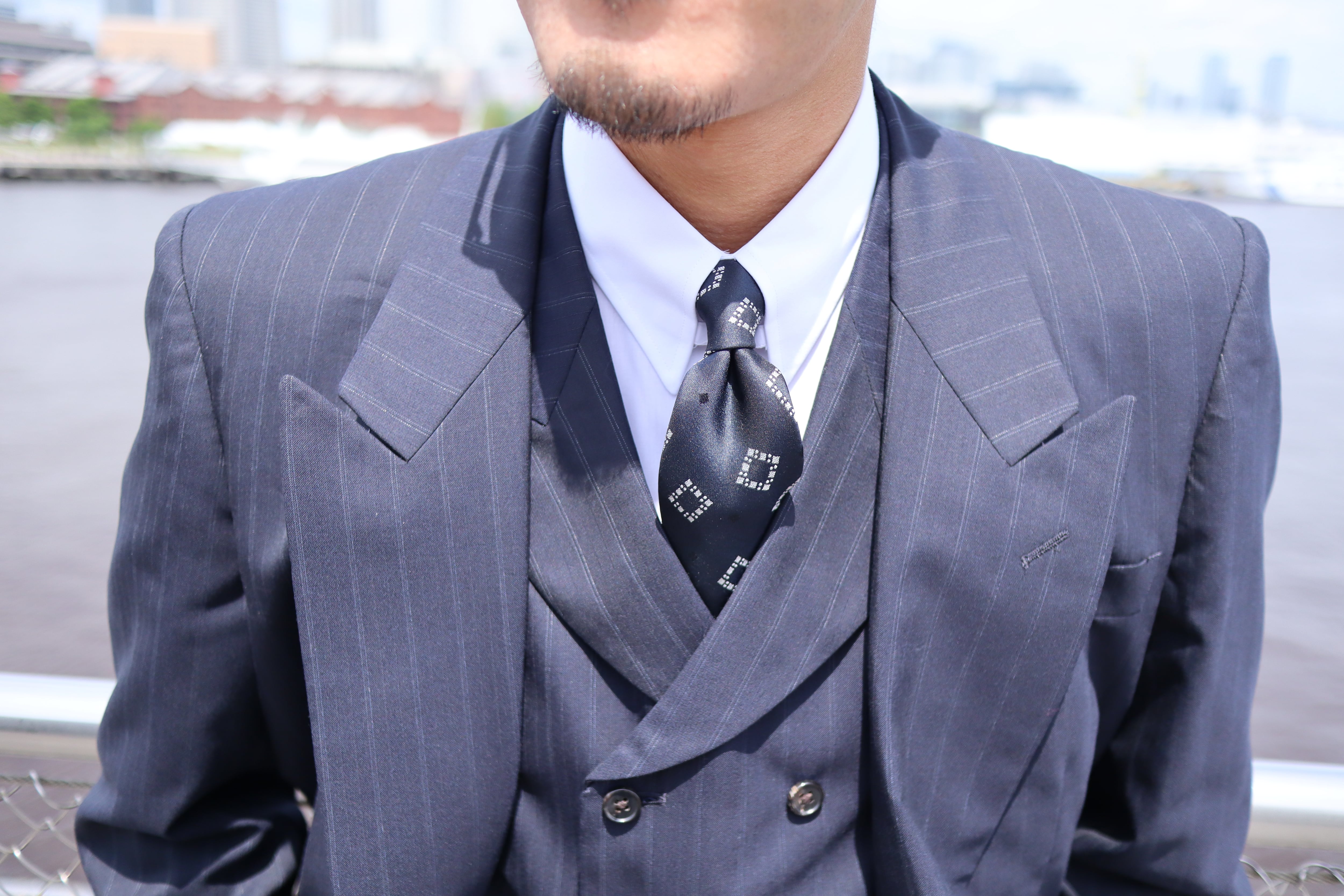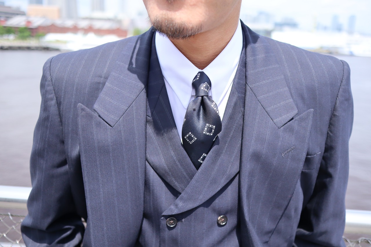 ジャケットは4ボタンのダブルブレストで、ゴージラインの低さが特徴です。広めの肩で肩パットは現代で着用してもカッコいいボリュームのものを入れ、無骨さのある雰囲気に。