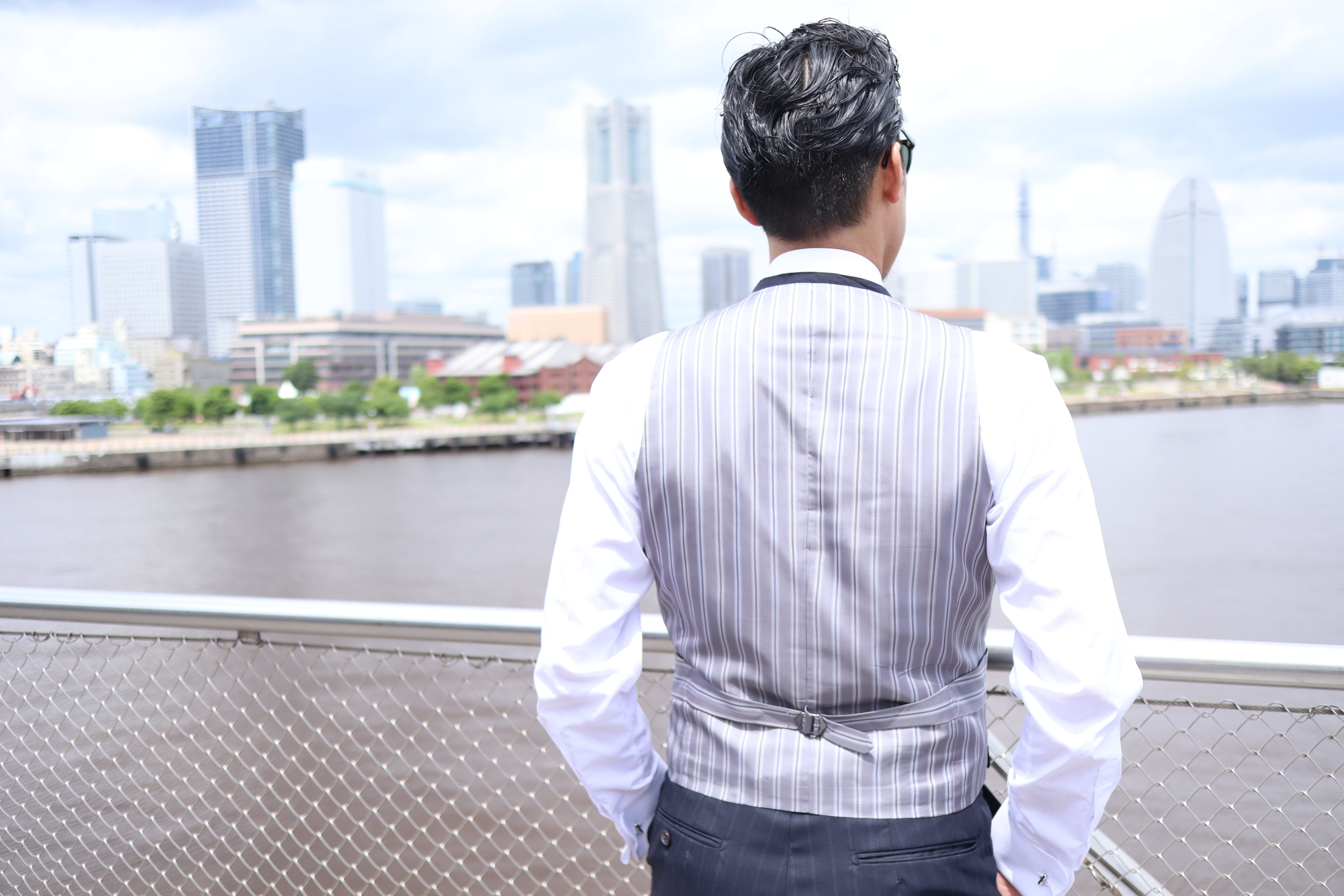 ベストの裏地はビンテージストライプと言われる、非常に珍しいストライプで尾錠がくびれているのも紳士の遊びです。