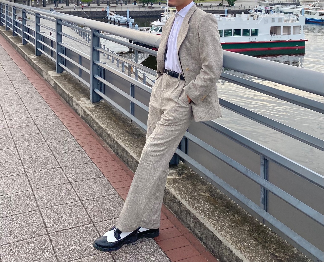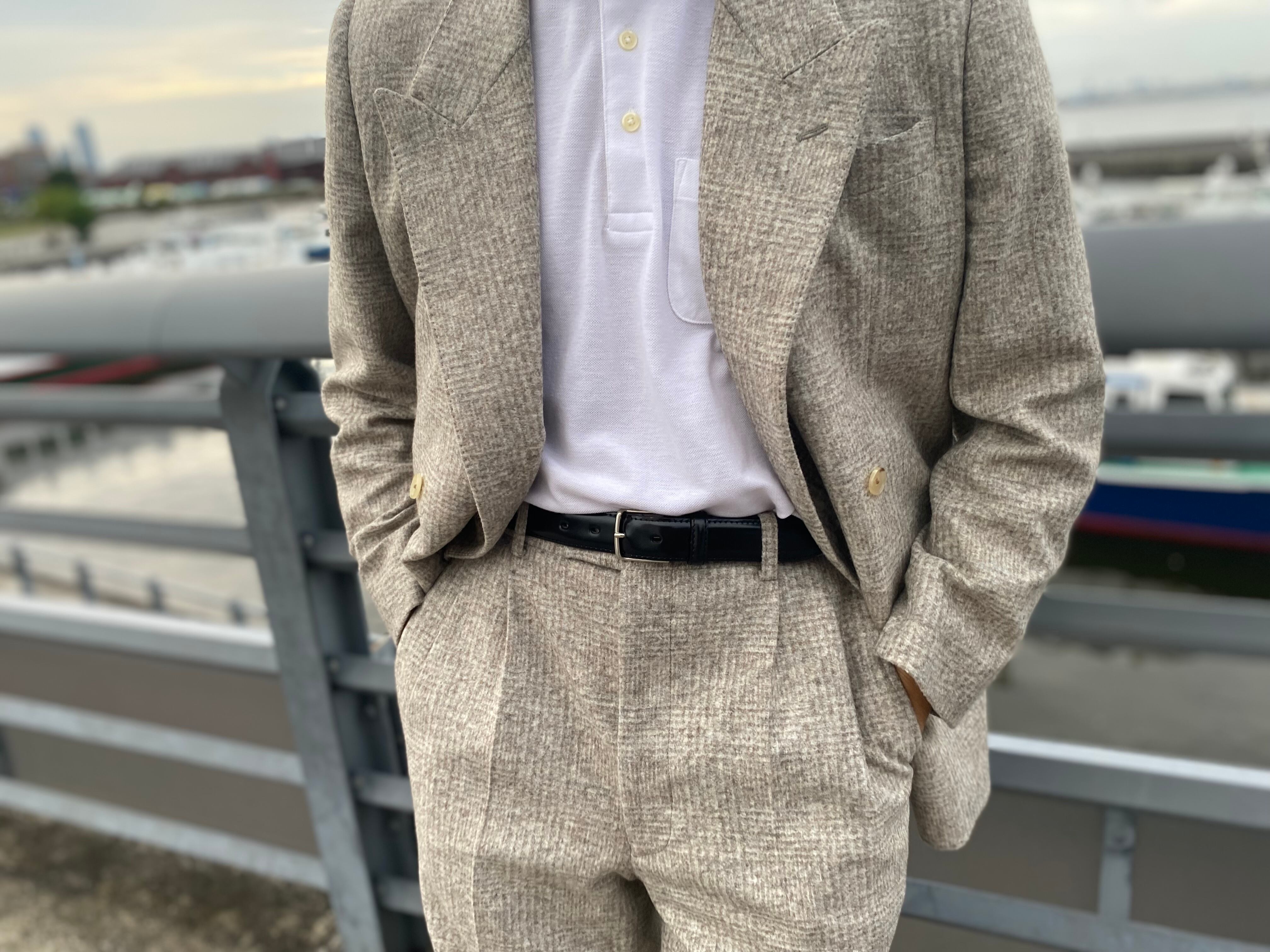 パンツはツータック、裾のダブル幅は4.5cmで、太さを残しつつ古臭くならないシルエットに仕上げています。