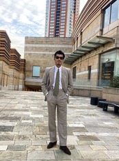 またまたのタカをイメージしたベージュのシャドウチェックダブルスーツです。