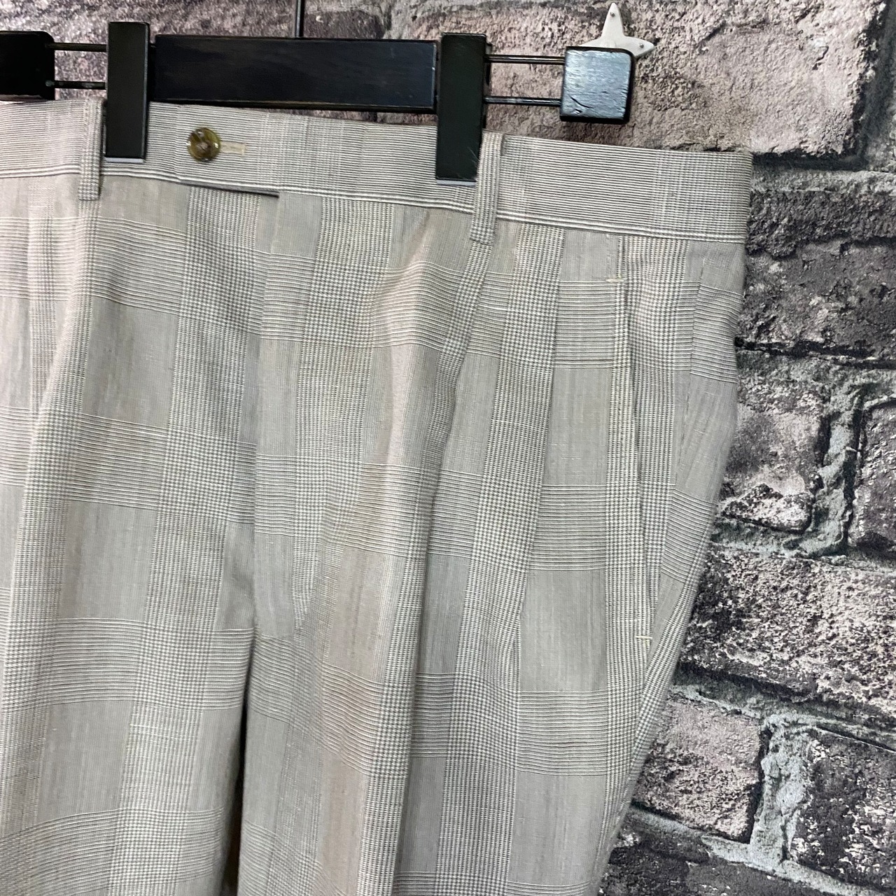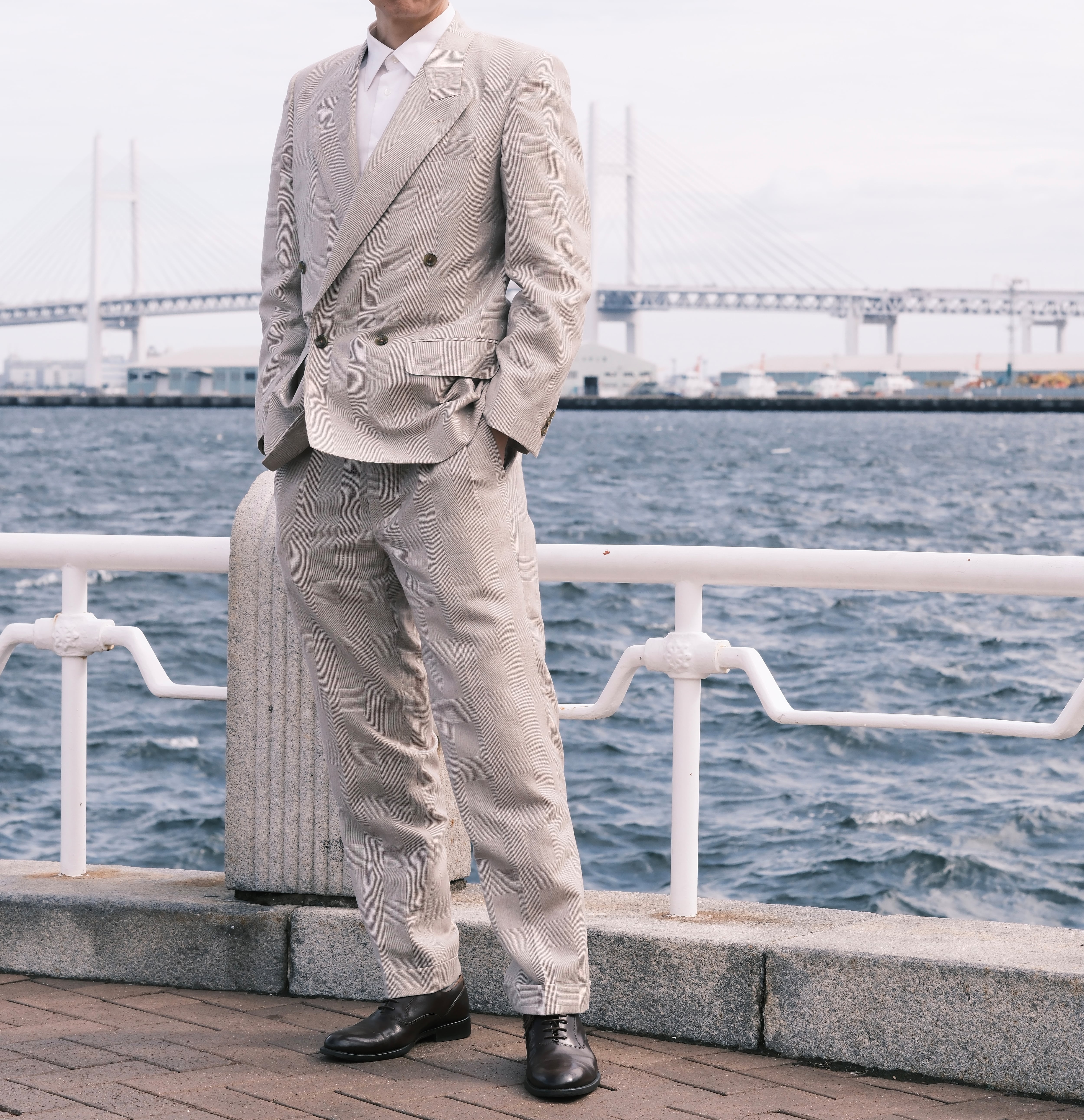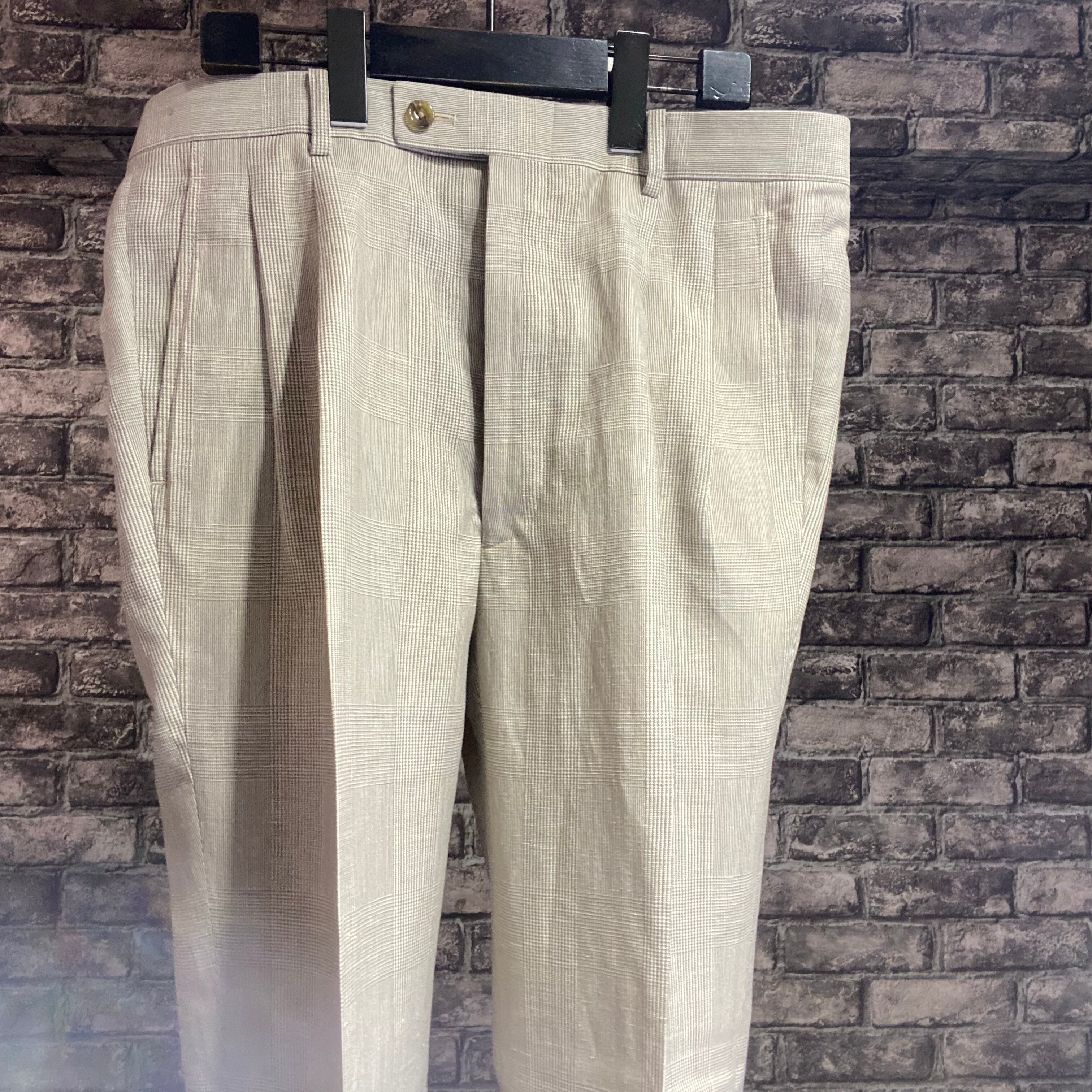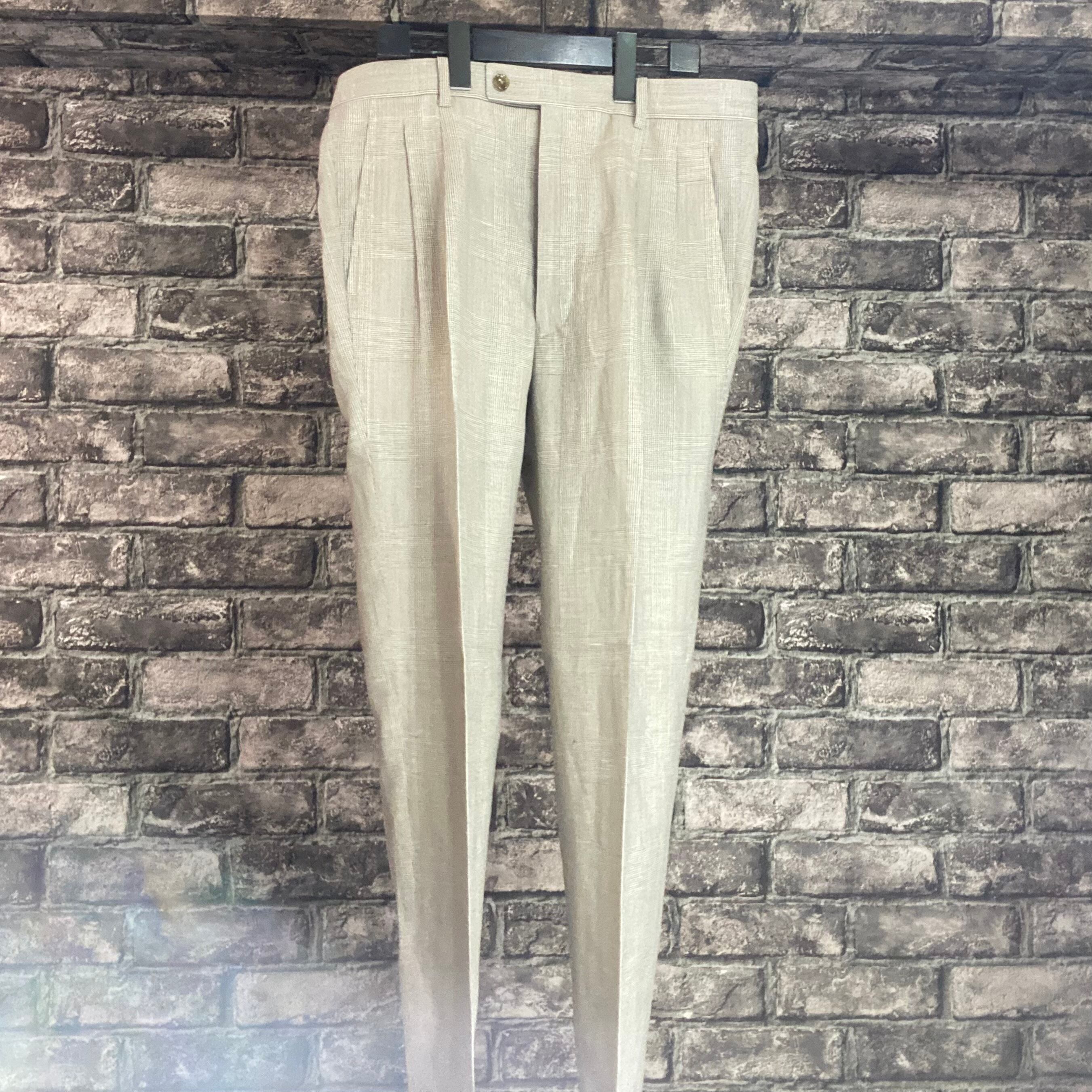 パンツはツータック、裾のダブル幅は4.5cmで、太さを残しつつ古臭くならないシルエットに仕上げています。