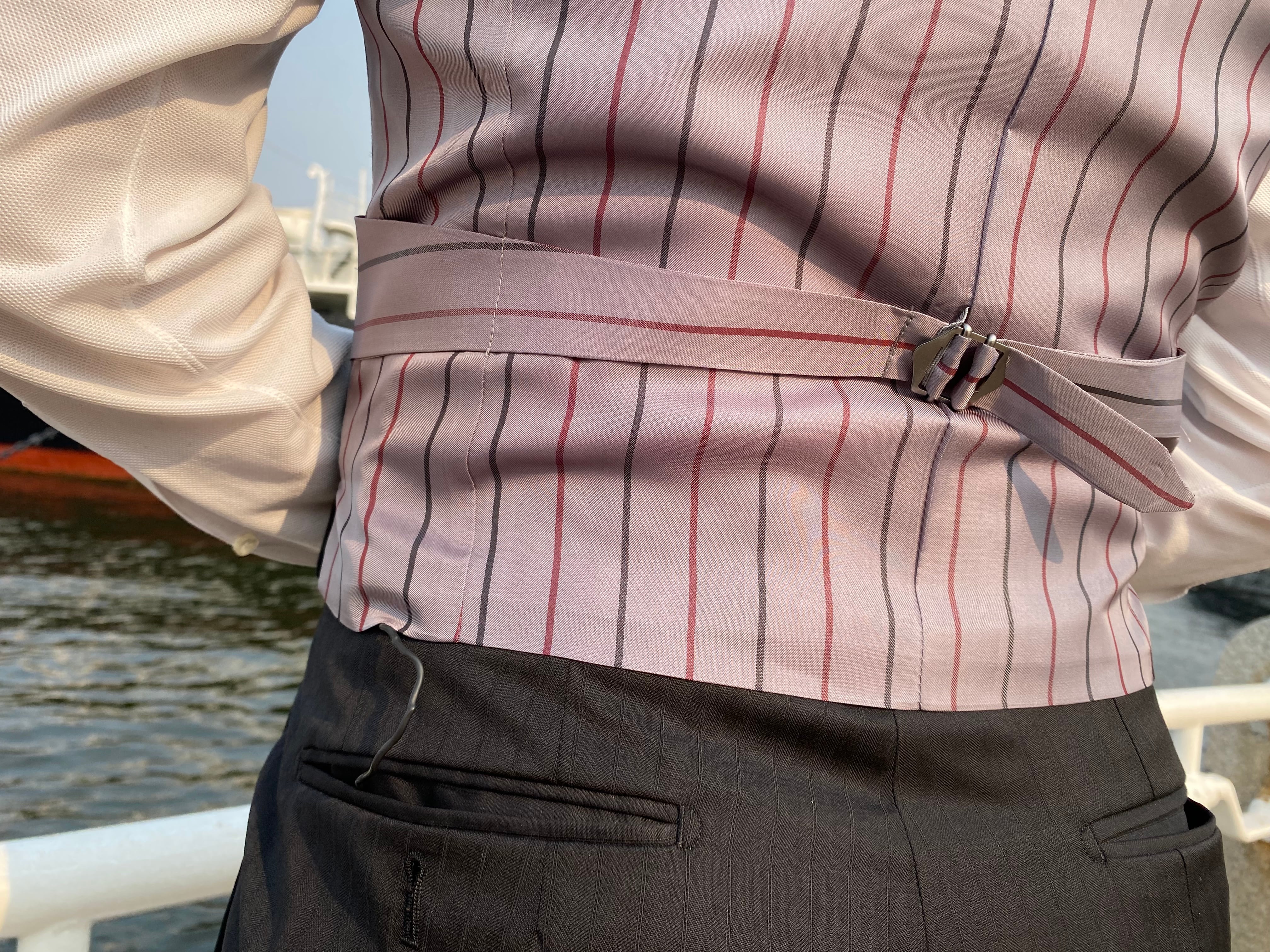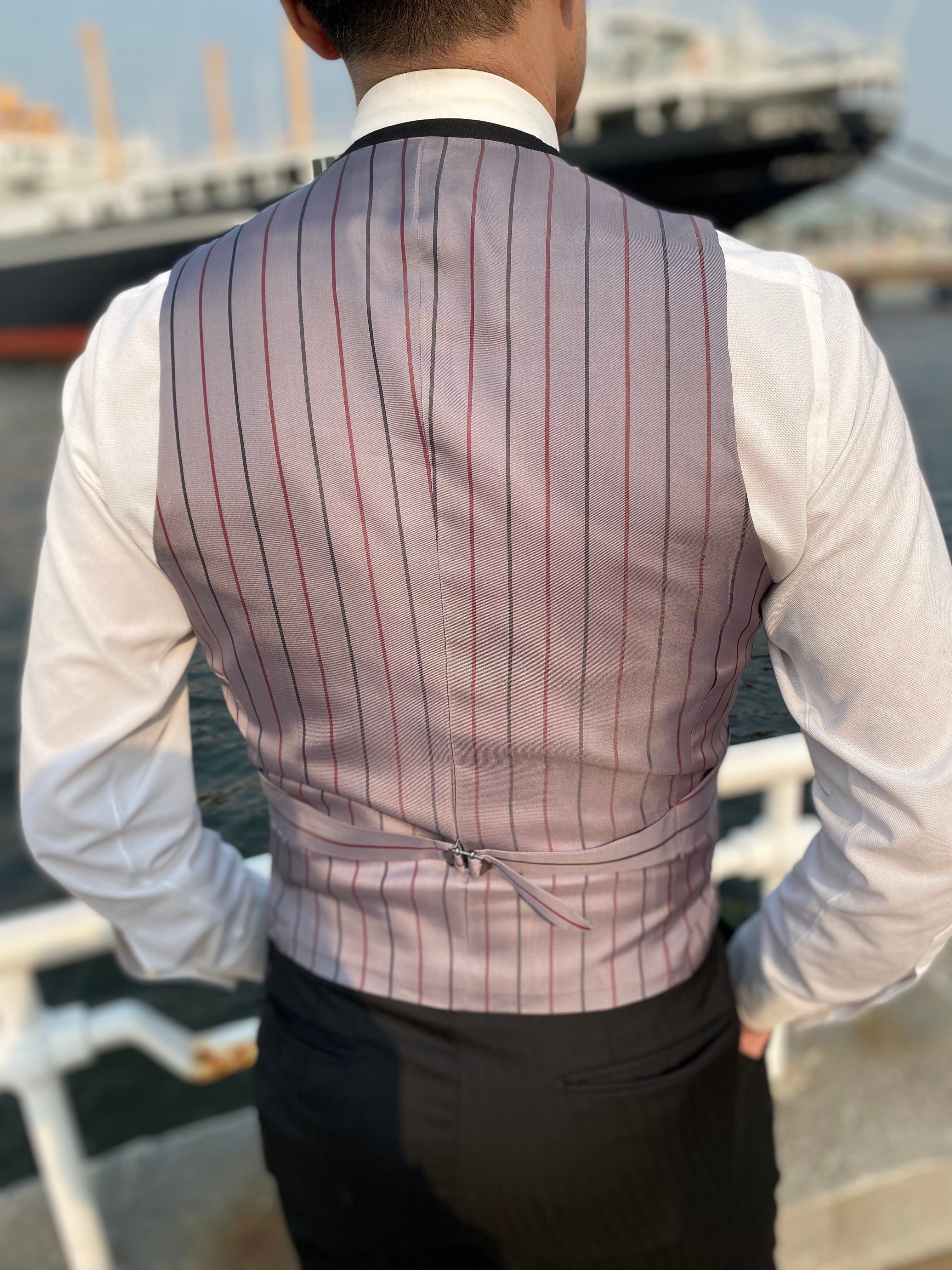 ベスト裏地:キュプラ100% 赤×チャコールグレーストライプ