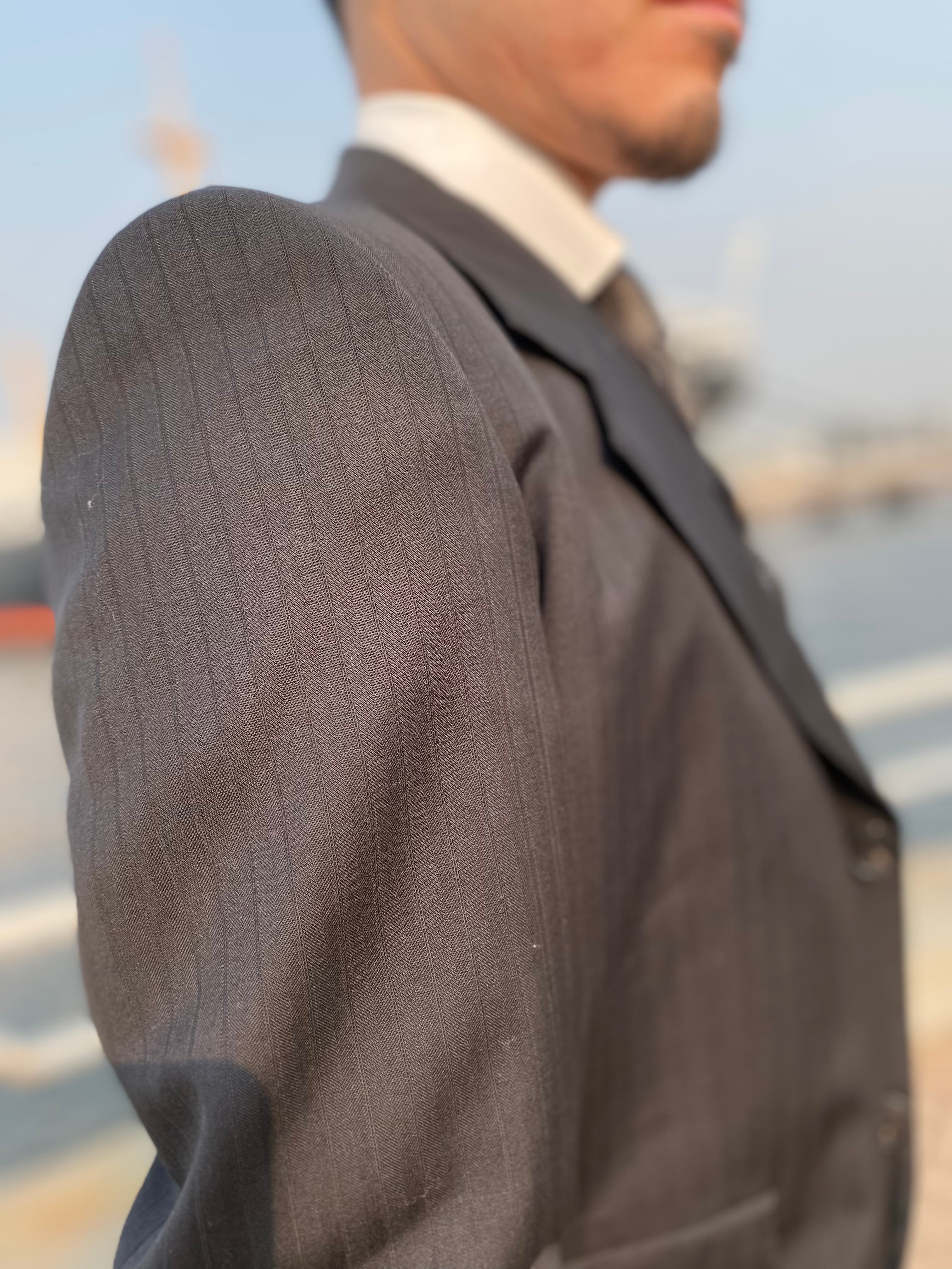ブラックヘリンボーン&ストライプの生地はクラシカルで、仕立て映えとドレープ感を両立した厳選されたクオリティのものを使用しております。