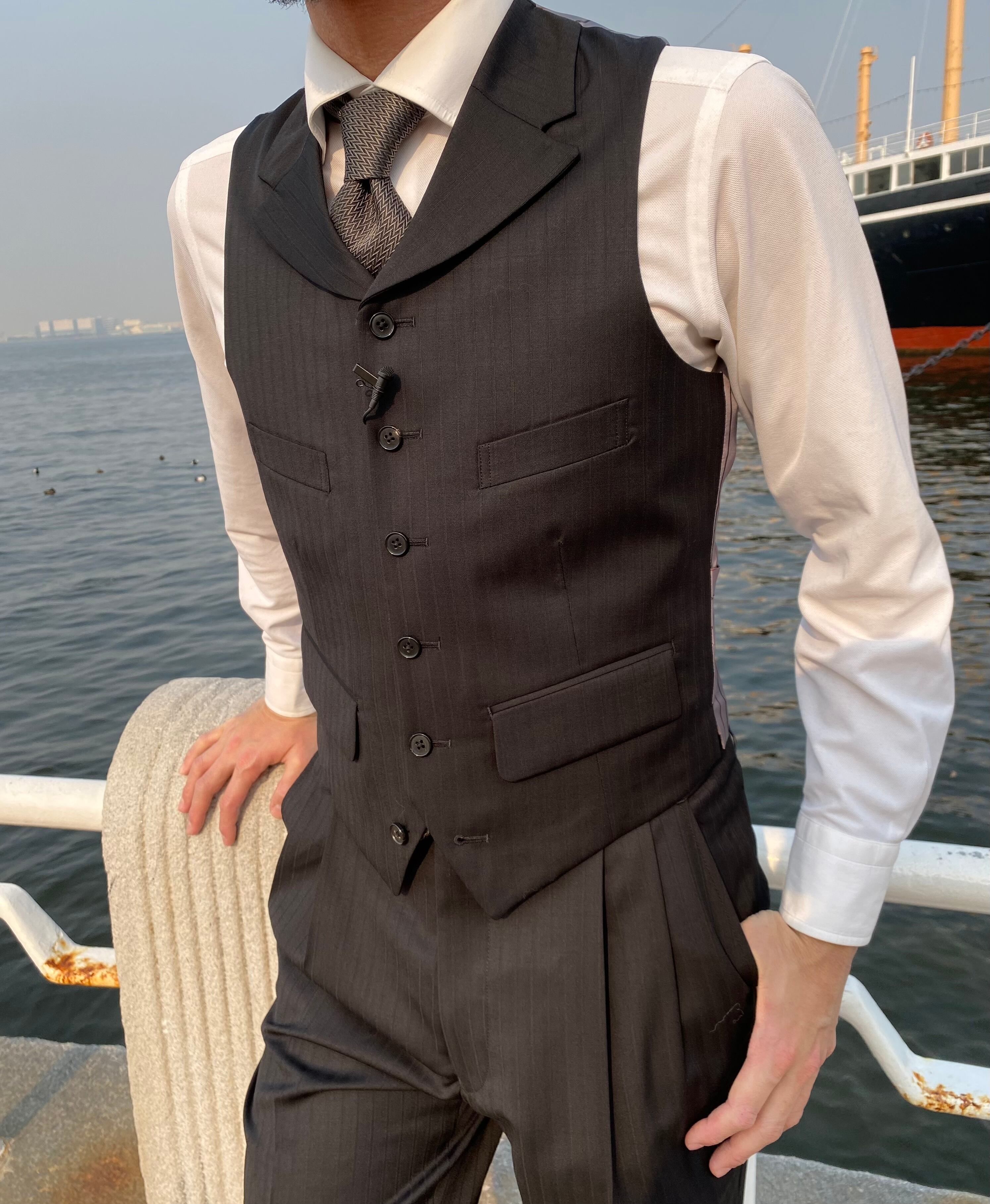 襟付きシングルベストの4ポケットが遊びの効いたデザインになっており、唯一無二なスリーピースです。