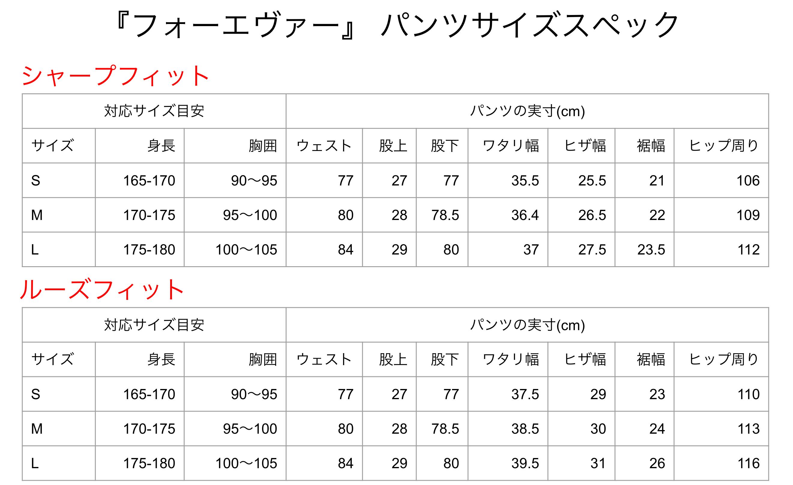 サイズスペックと直立不動の3枚の写真を確認いただき。シャープなシルエットでいい方は"シャープフィット"を、よりタカの雰囲気が好みの方は"ルーズフィット"をお選びください。