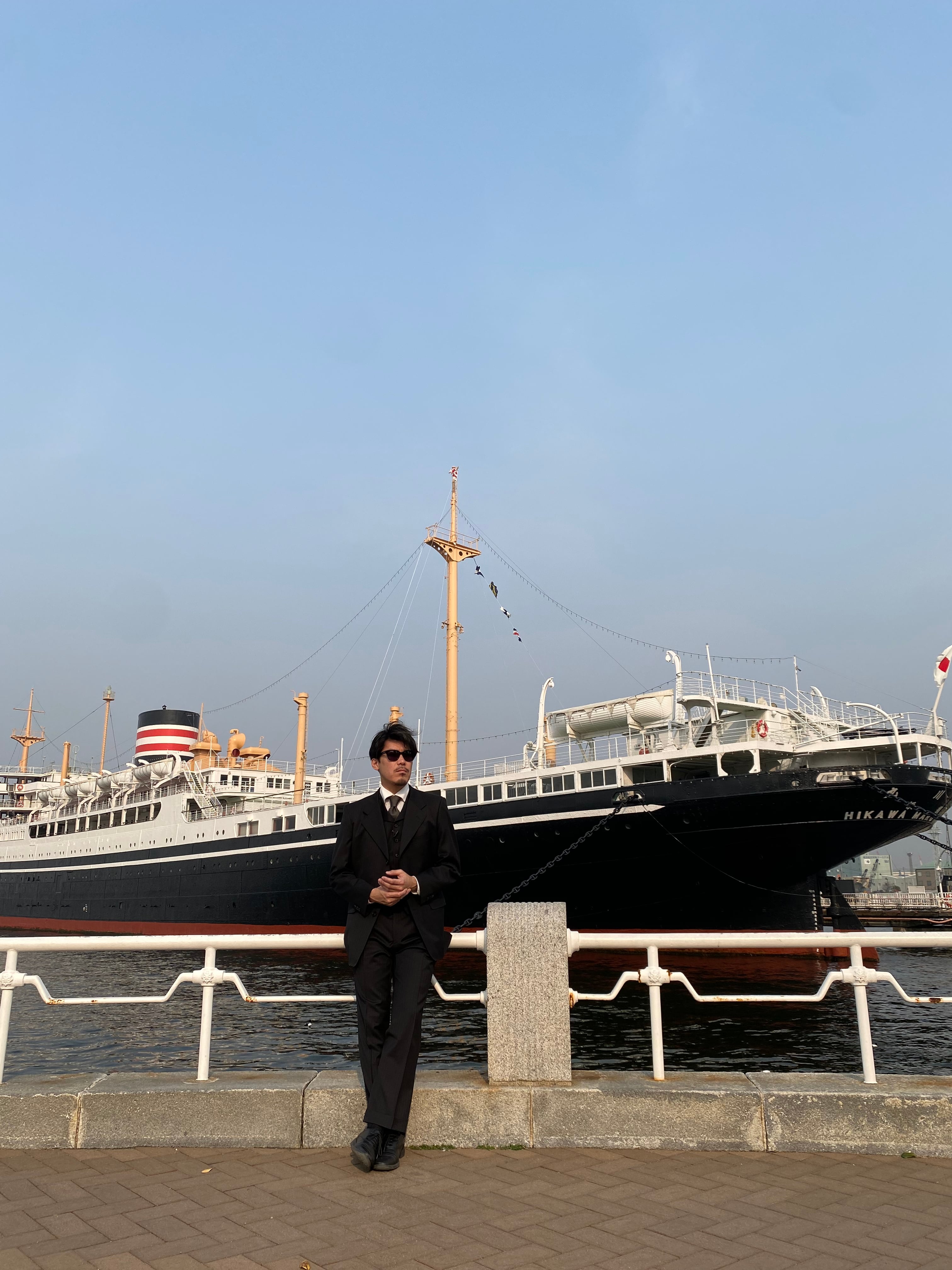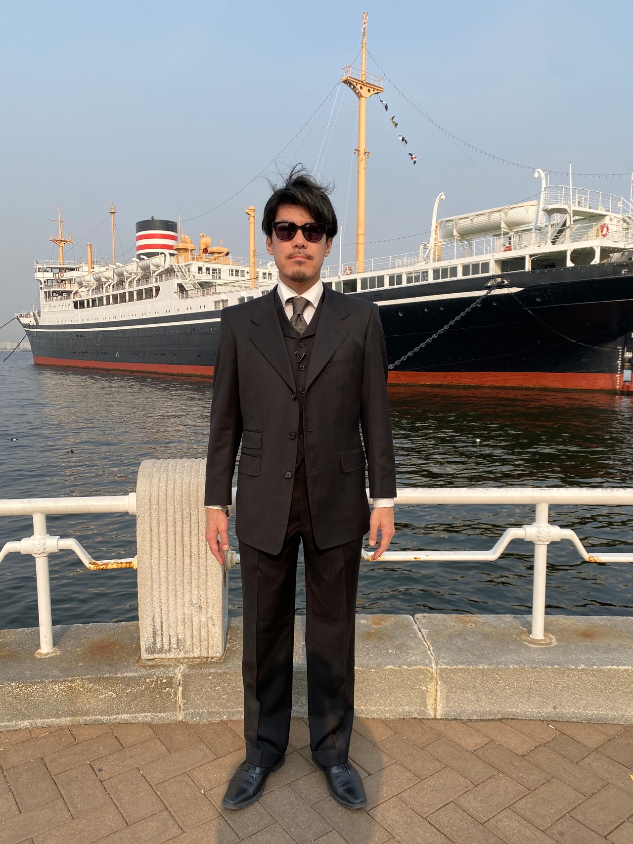 あえてボックスシルエットの上着、ピタッとさせたベストからパンツへのラインが美しく、ツータックの渋さが際立ちます。