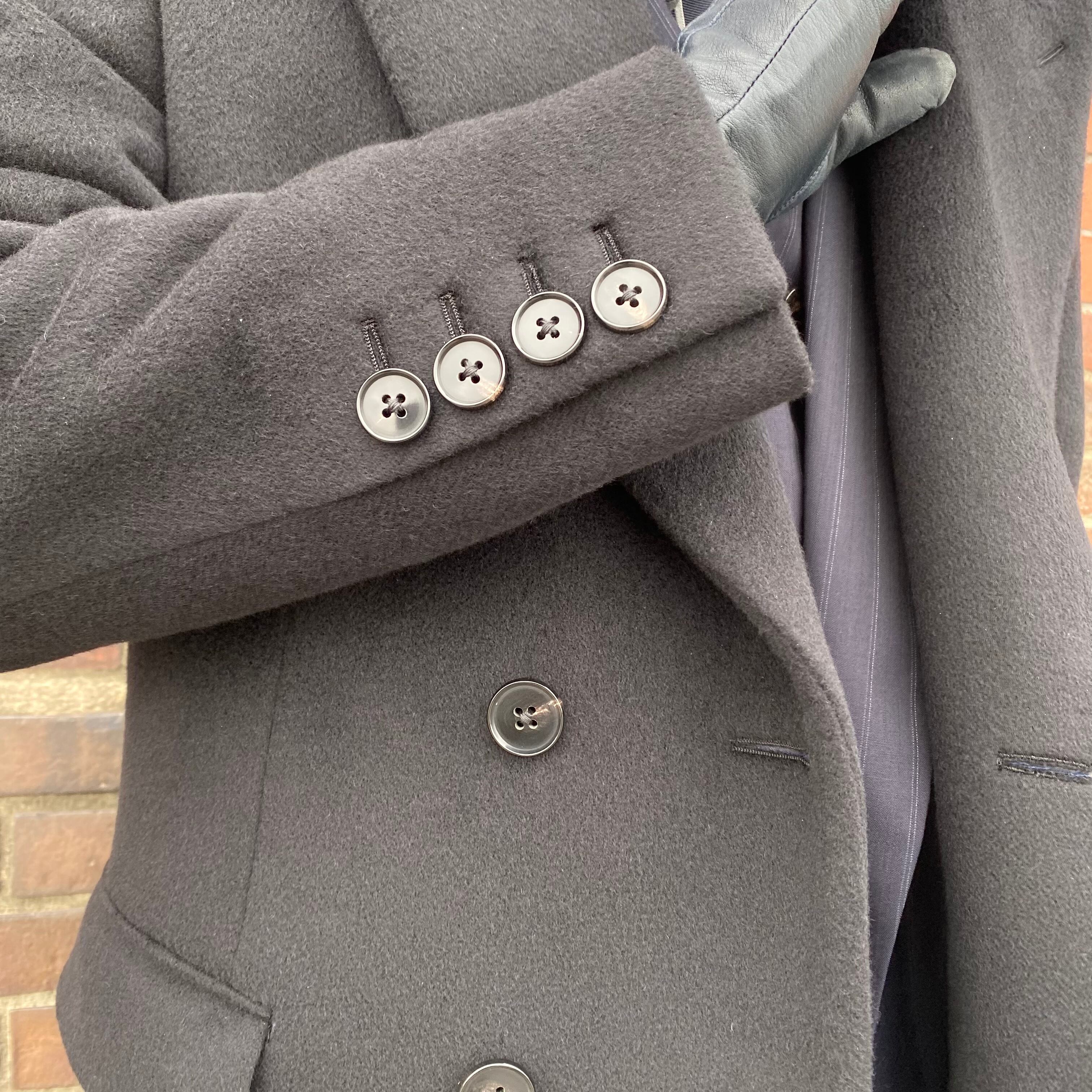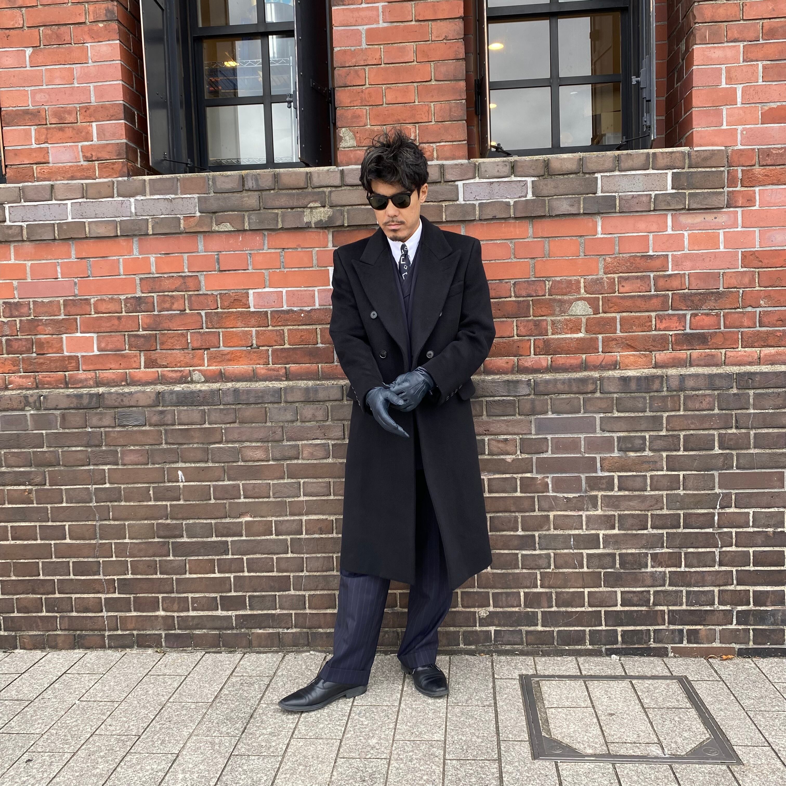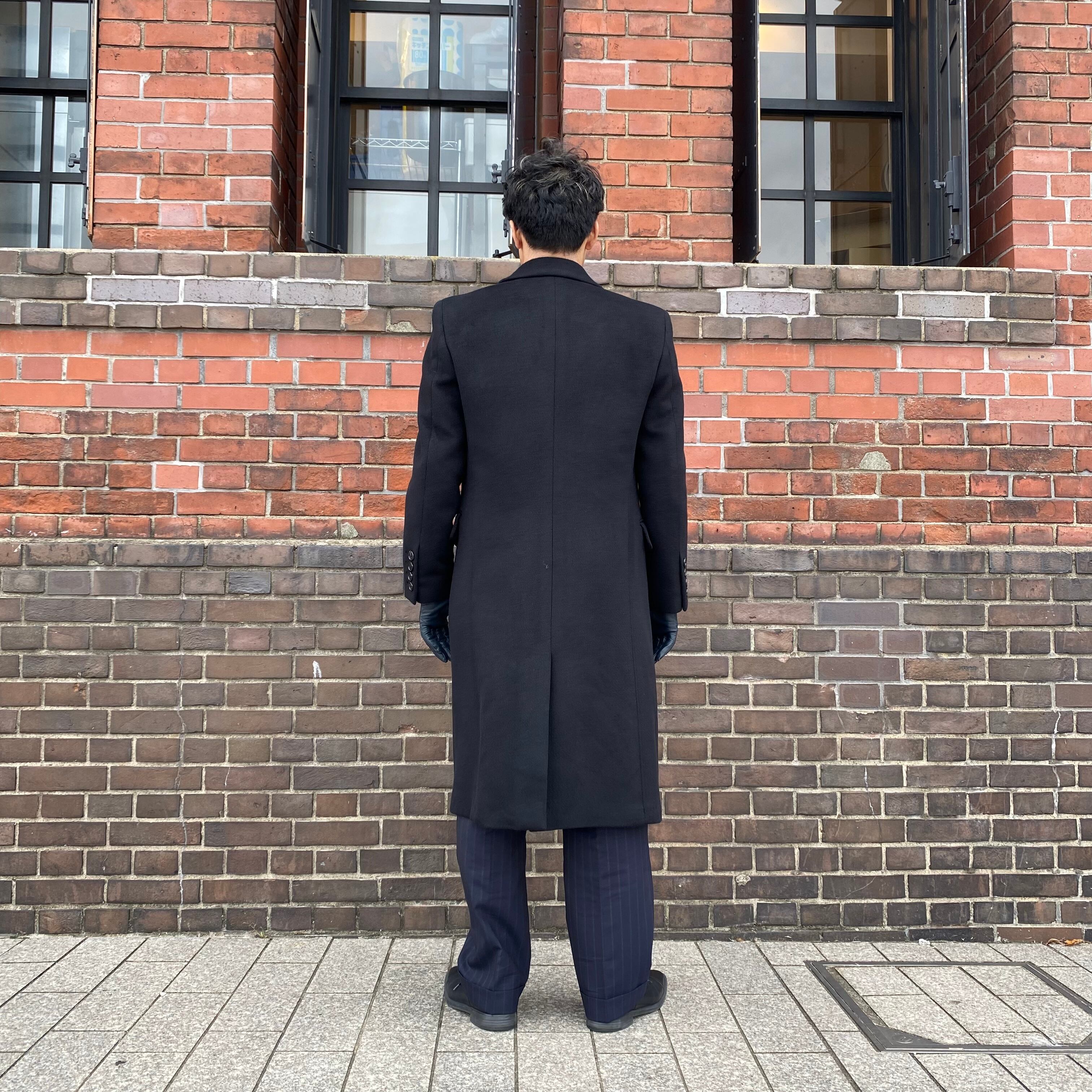 タカのダブルチェスターコートを当時の型から起こした、カシミヤ&ウール&ナイロンのダブルチェスターロングコートです。(※実際の仕上がりのコートは当写真より少しマットなブラックになりますのでご注意ください)