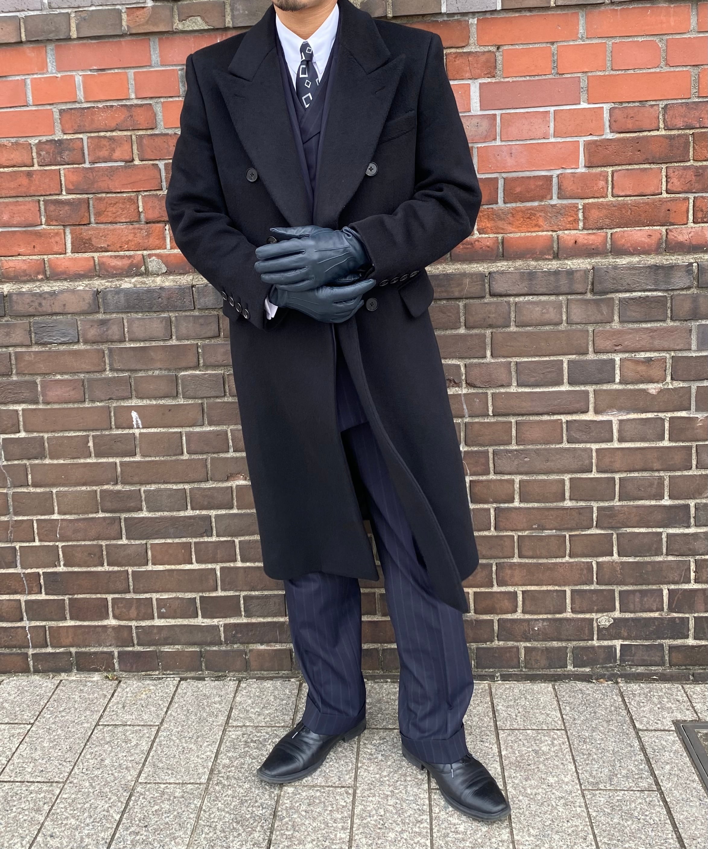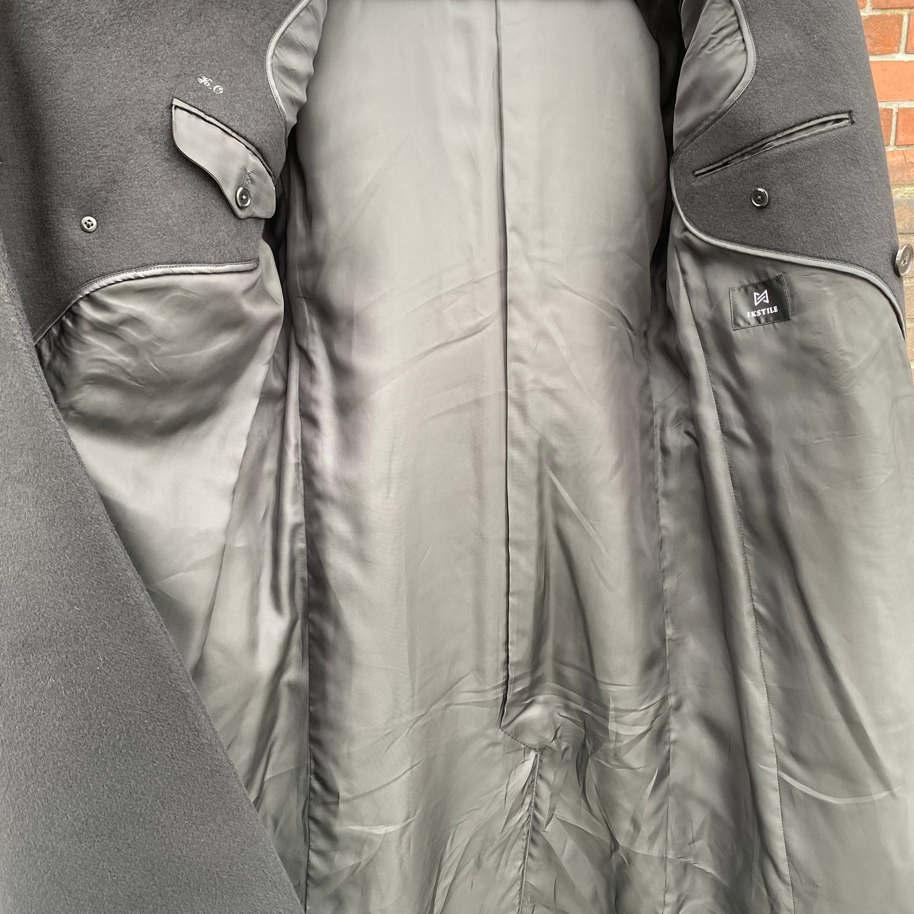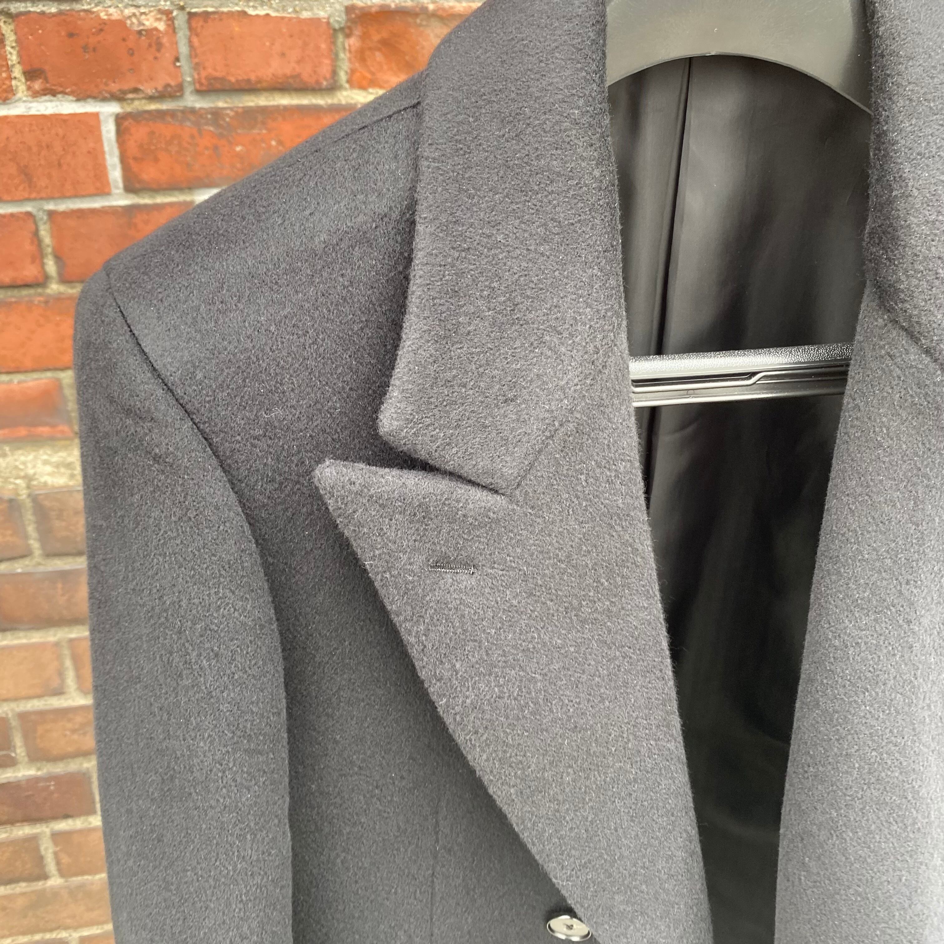 タカのダブルチェスターコートを当時の型から起こした、カシミヤ&ウール&ナイロンのダブルチェスターロングコートです。(※実際の仕上がりのコートは当写真より少しマットなブラックになりますのでご注意ください)