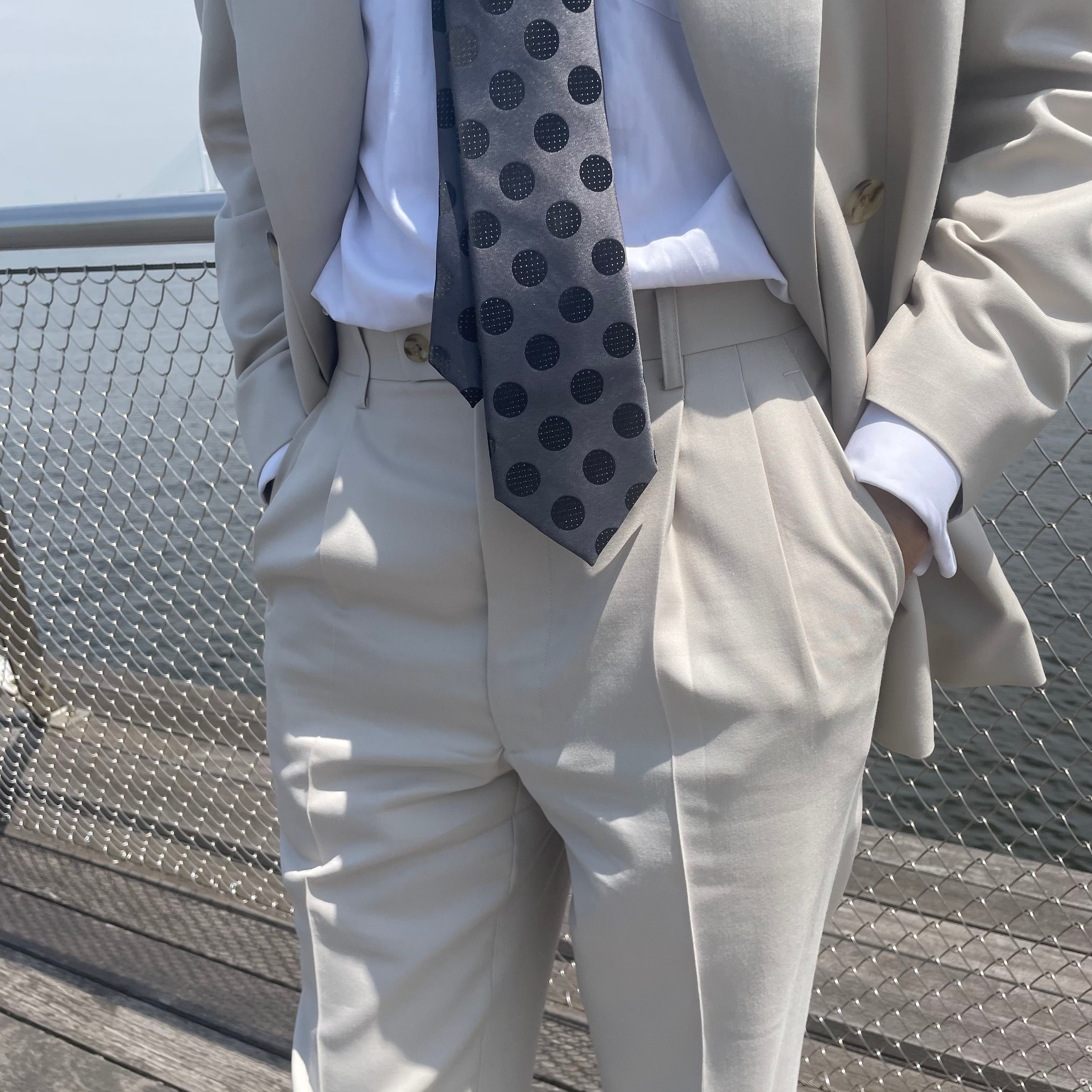 パンツはツータック、裾のダブル幅は4.0cmで、太さを残しつつ古臭くならないシルエットに仕上げています。