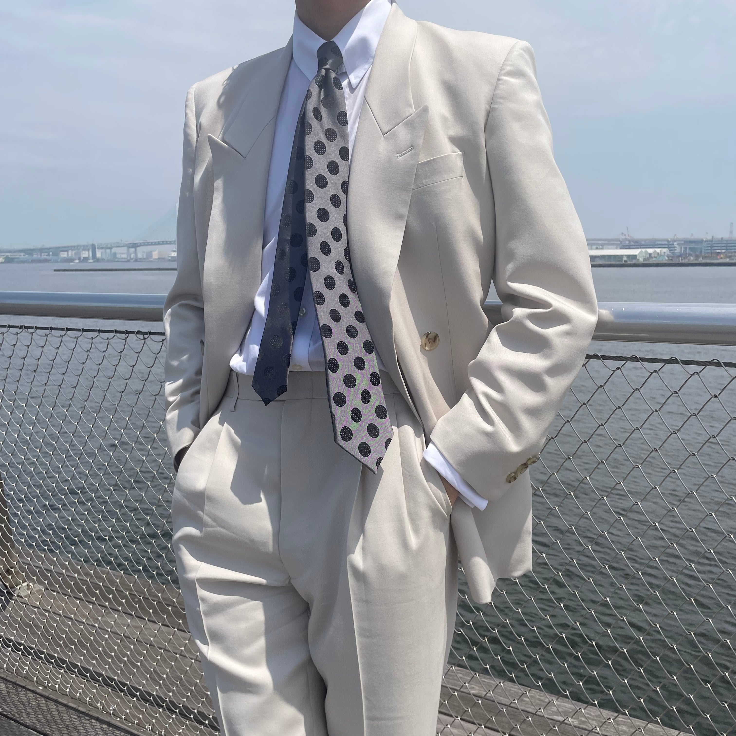 80年代の世界観を存分に味わえるジャケットのゴージの低さ・肩の造りで、現代で着用しても格好良いボリュームの肩パットを入れ、男らしさのある雰囲気に。