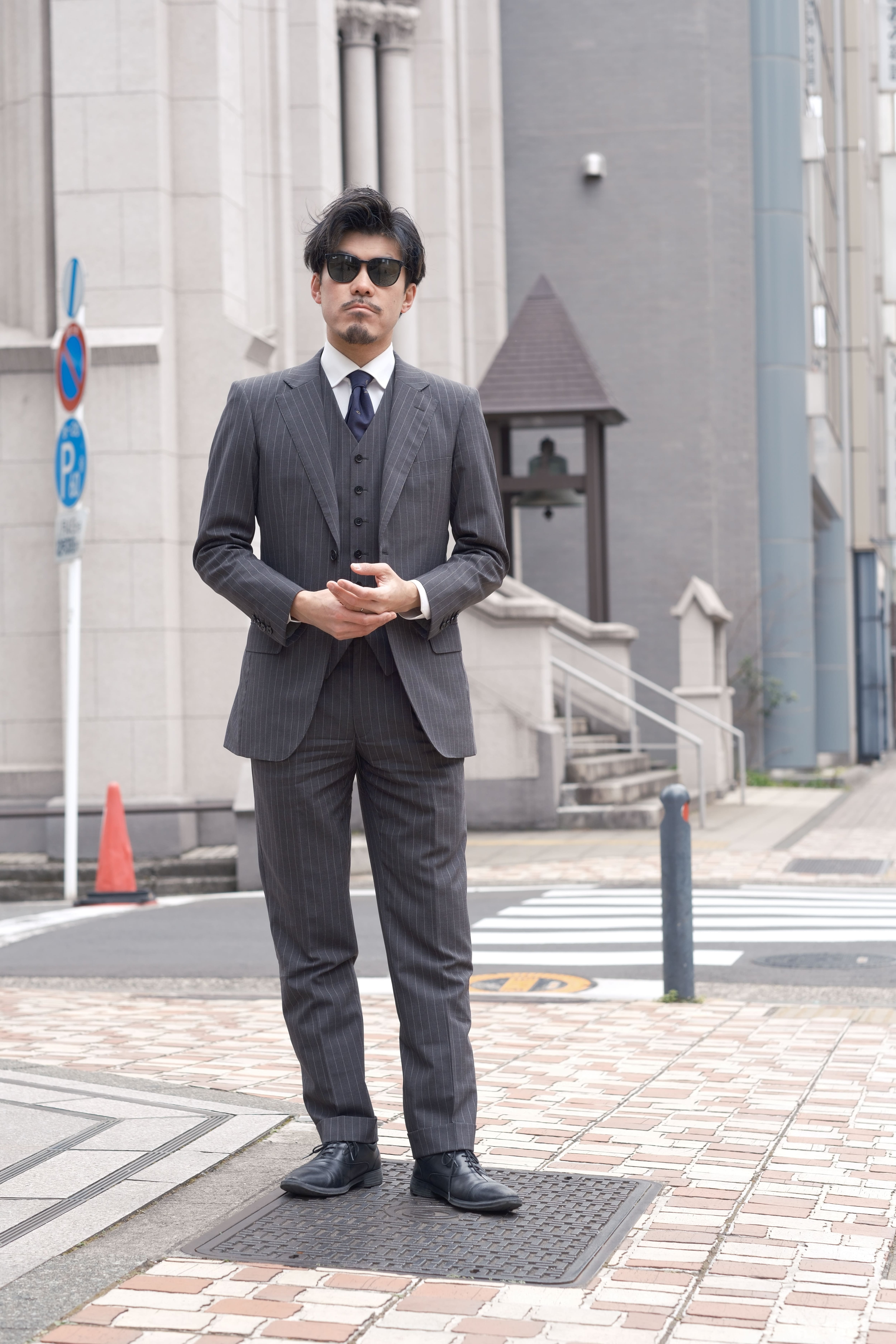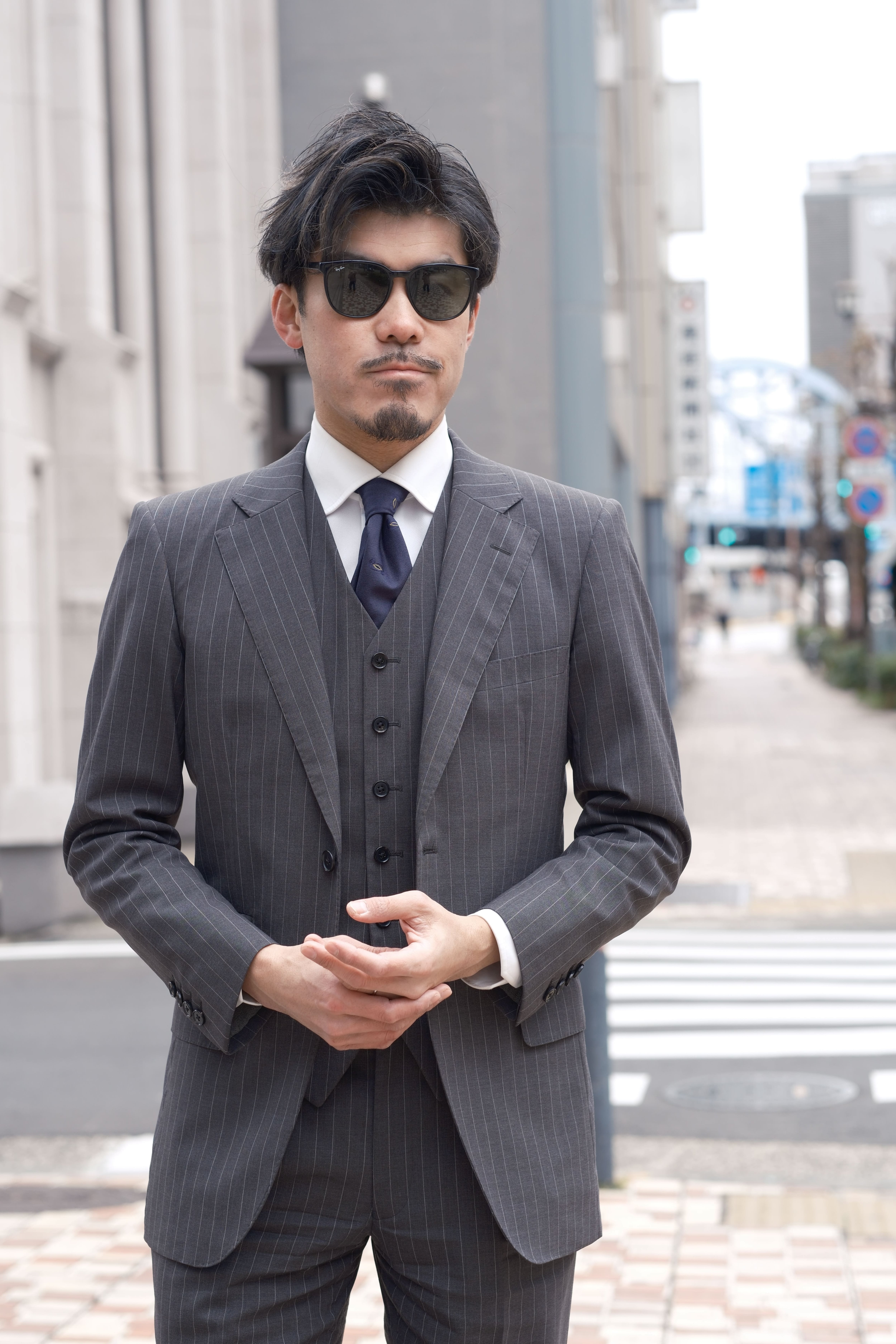 適度なテーパードが効き、スタイリッシュさとダンディズムを感じる『さらば』のタカをイメージしたスリーピーススーツです。