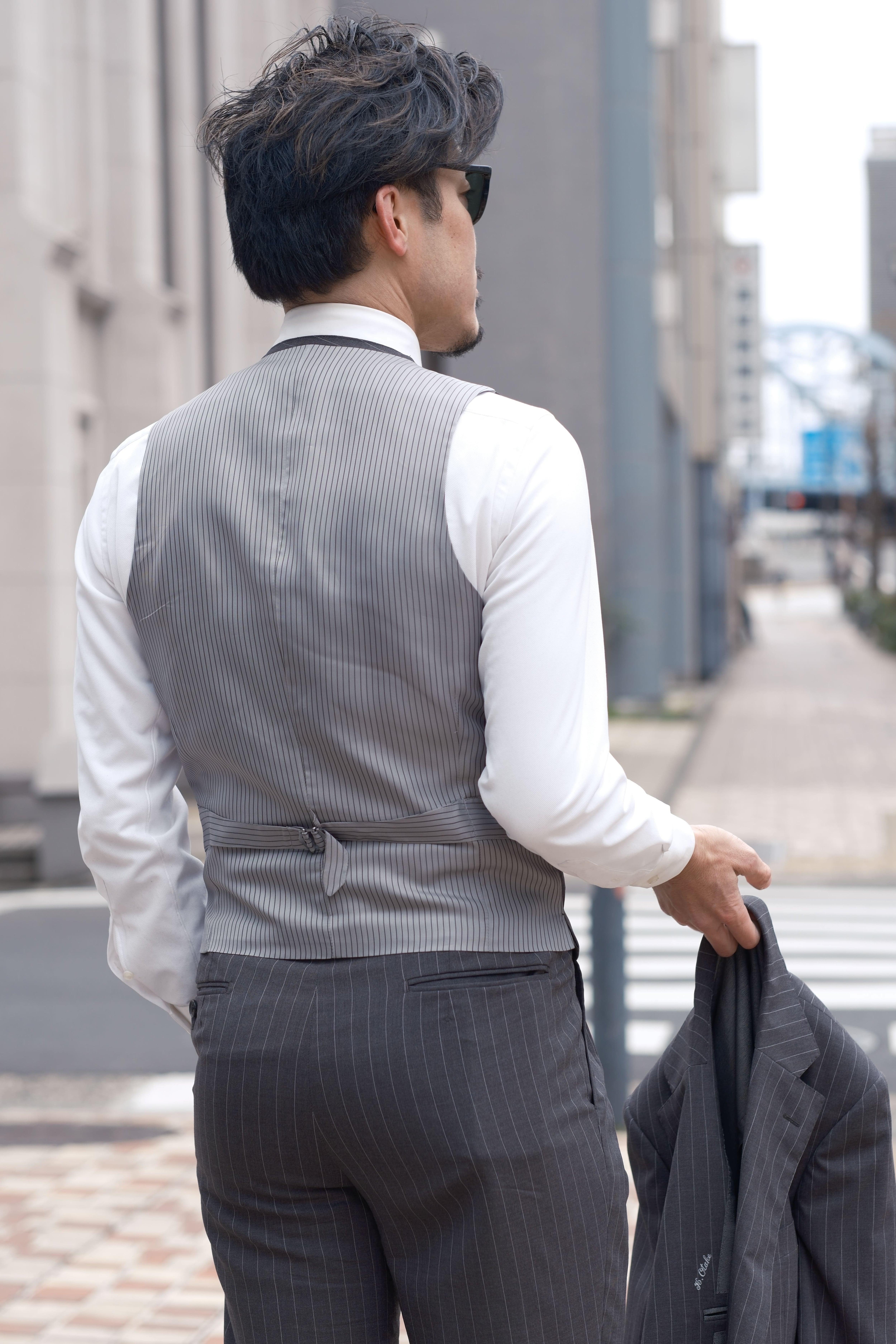 ベストの裏地はビンテージストライプと言われる、クラシックなストライプで尾錠がくびれているのも紳士の遊びです。